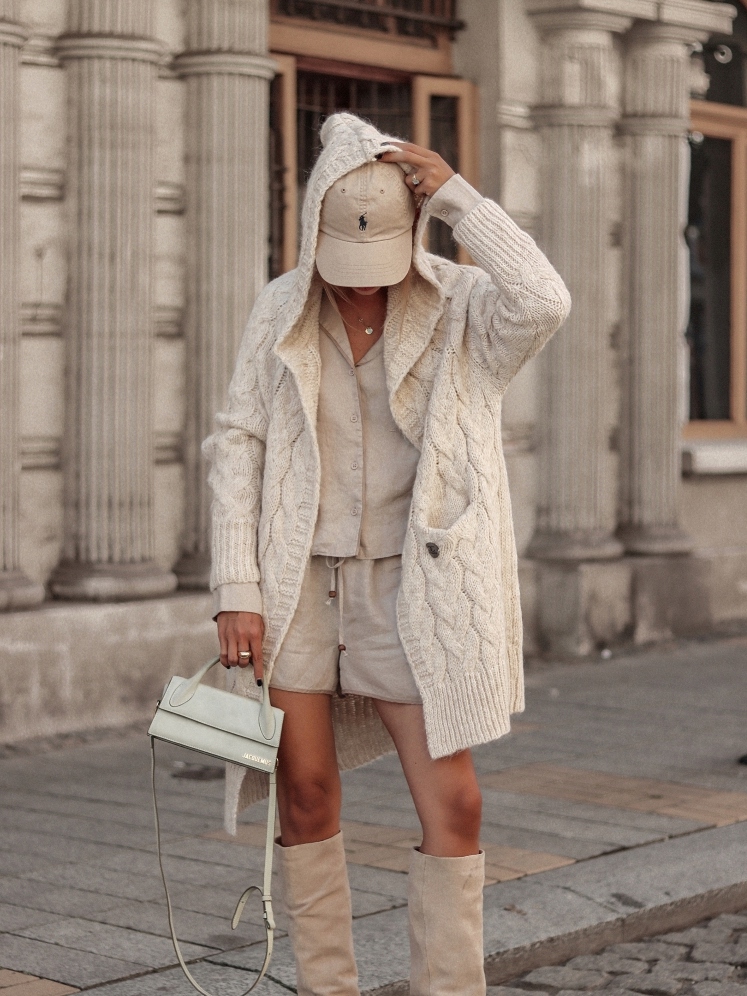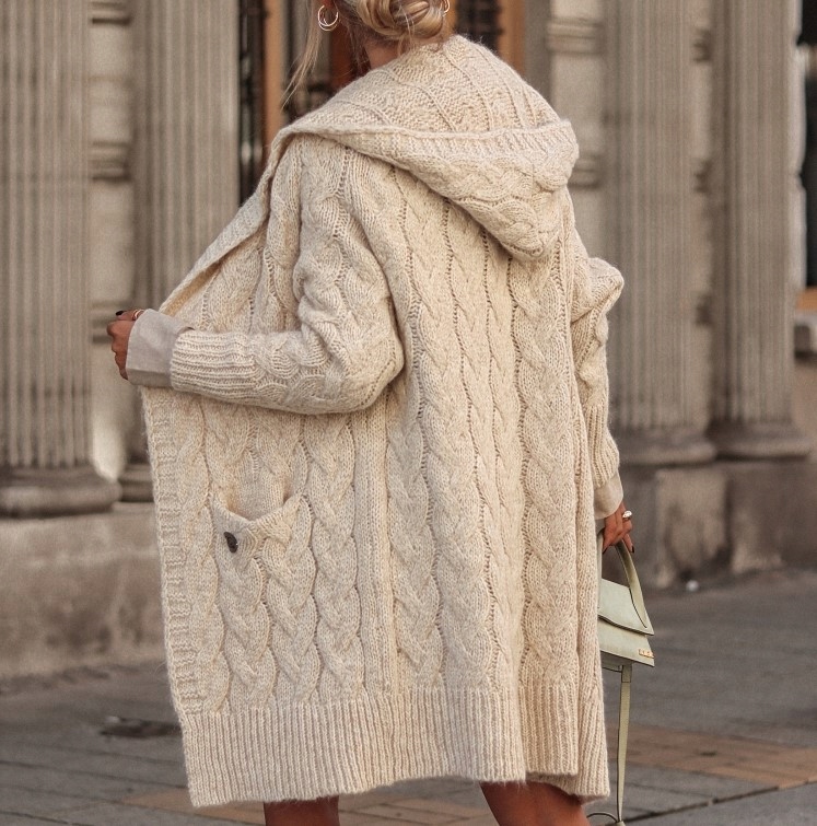 - Rewelacyjny sweterkowy płaszcz z obszernym kapturem. Wykonany z wysokiej jakości przędzy. Dwie kieszenie