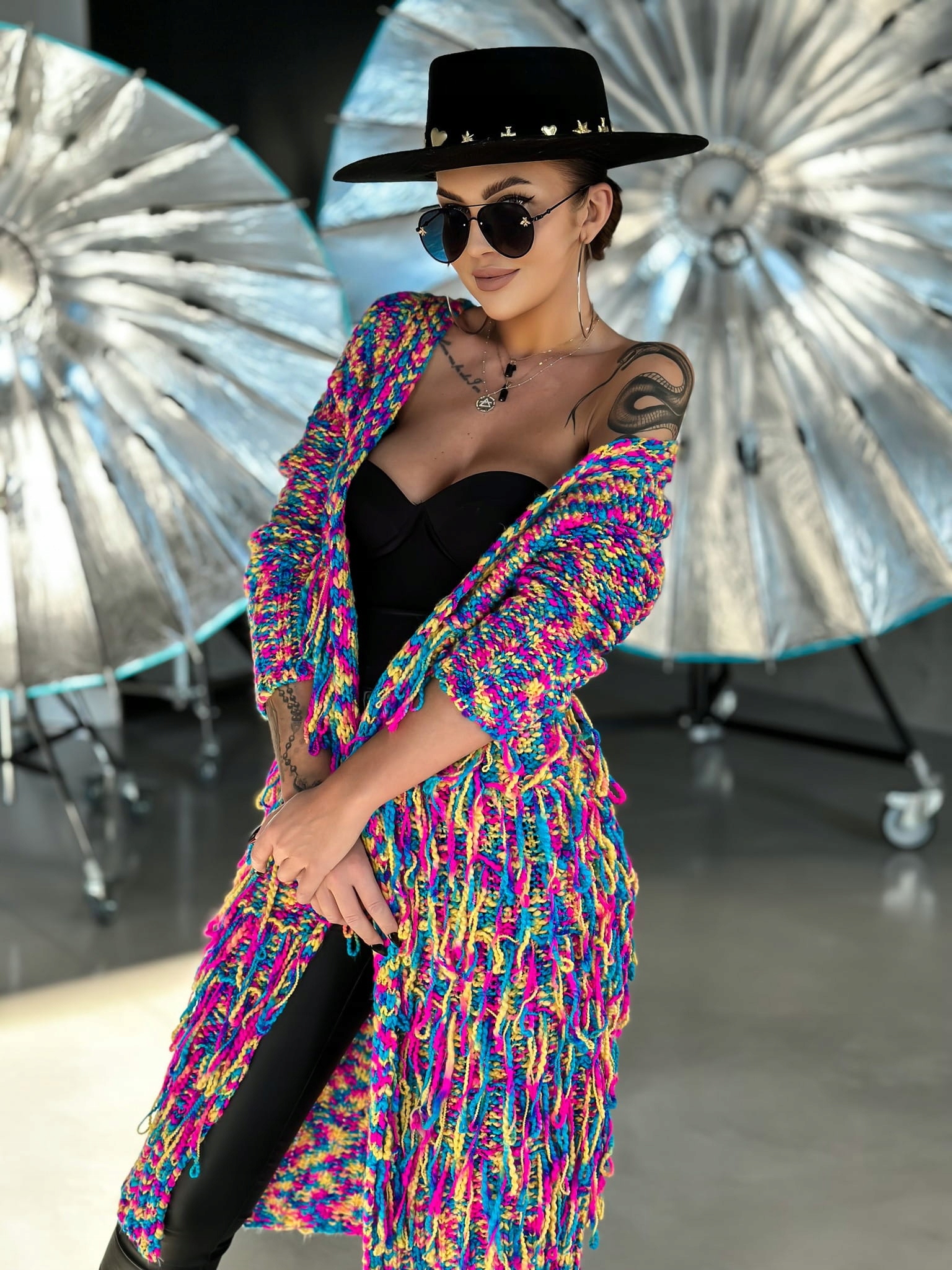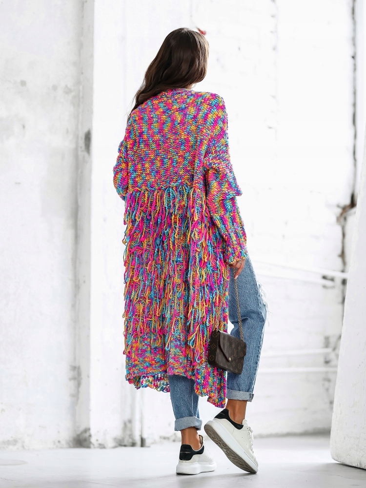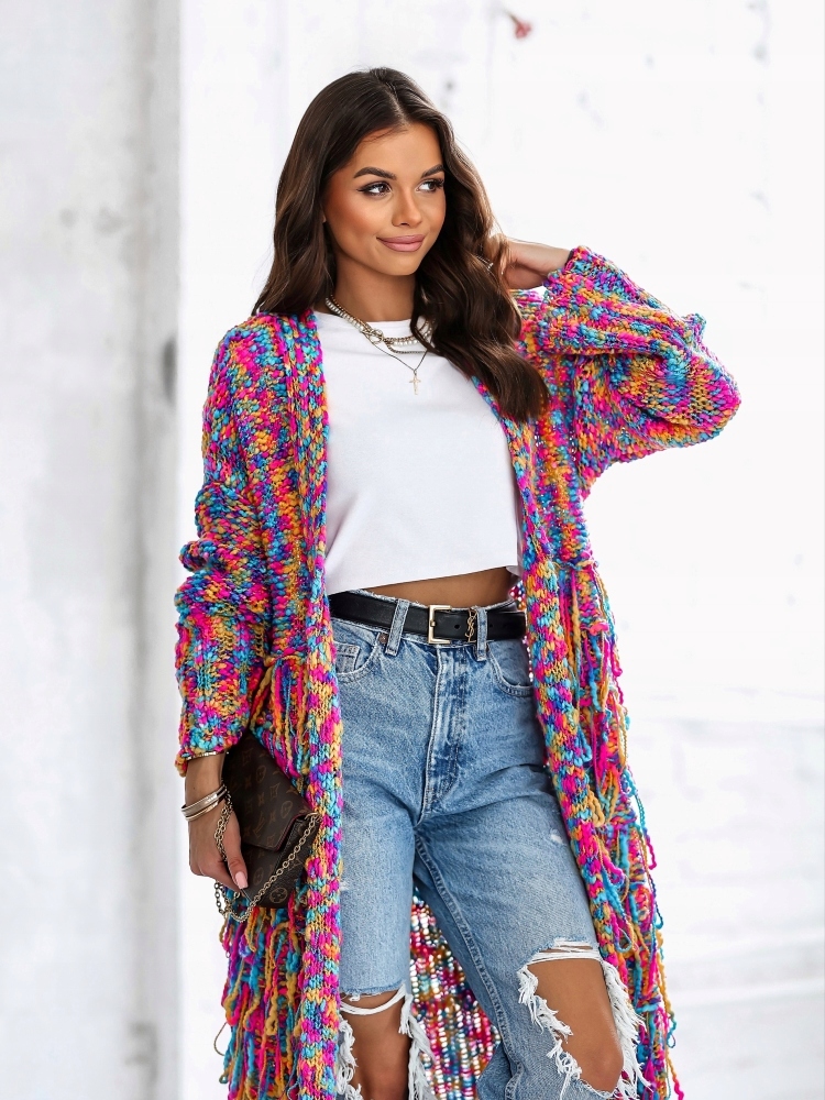 - Efektowny, luźny kardigan w stylu Boho. Wykonany z wysokiej jakości przędzy. Miękki i miły w dotyku. Dodatkowym atutem są modne frędzelki