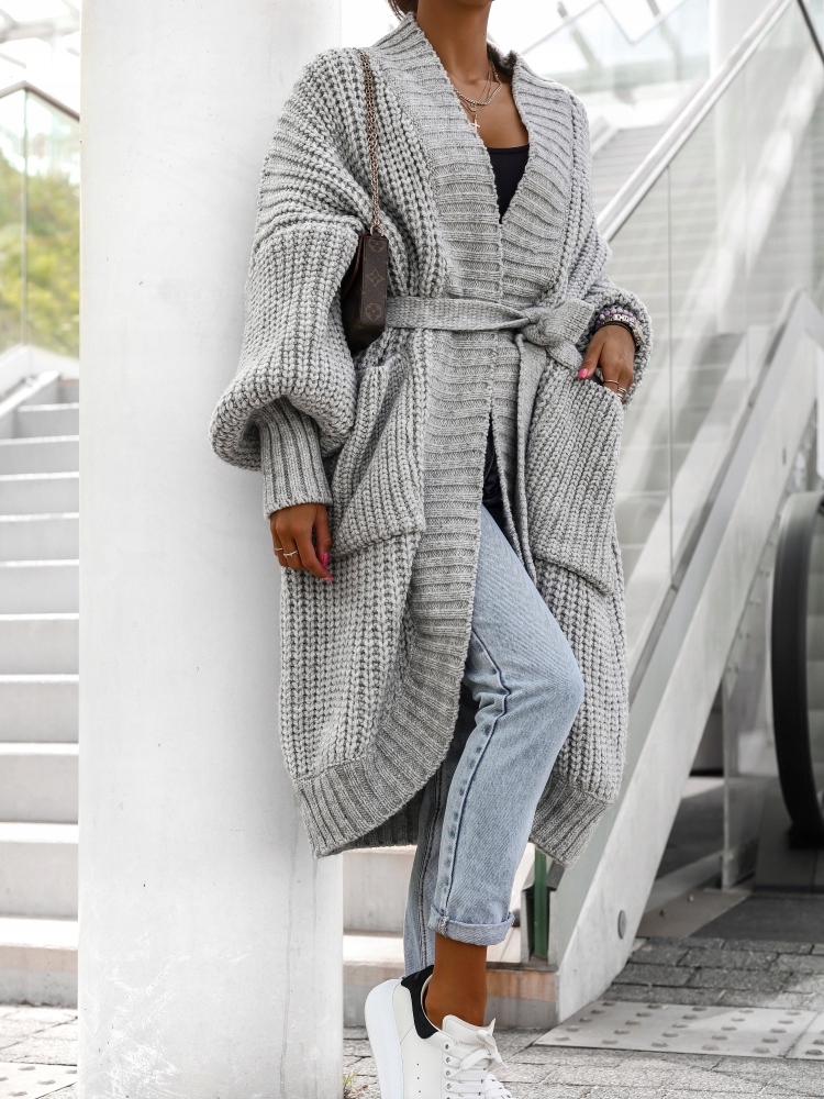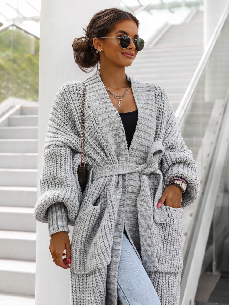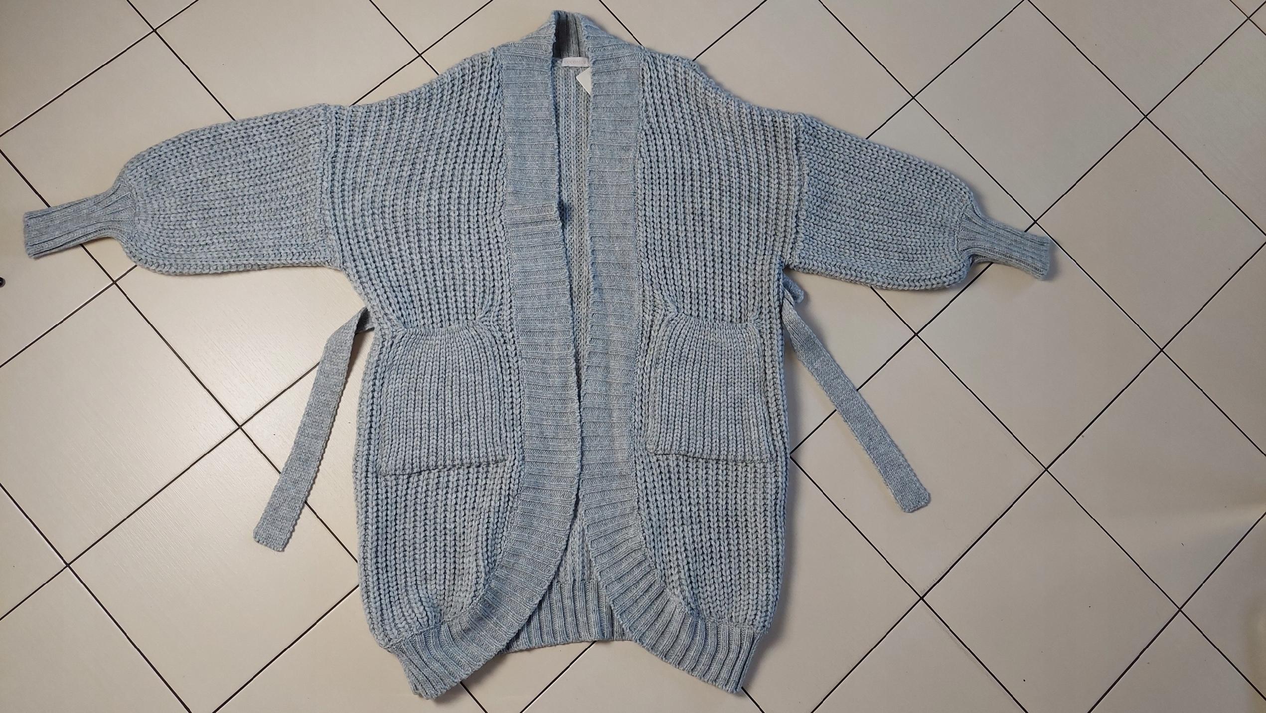 - Ten nowy fantastyczny kardigan to propozycja na obecny sezon. Zastąpi zarówno płaszcz lub kurtkę. Wykonany z miłej w dotyku przędzy. W talii znajduje się wiązany pasek z tego samego materiału. Dodatkowym atutem są pojemne kieszenie.