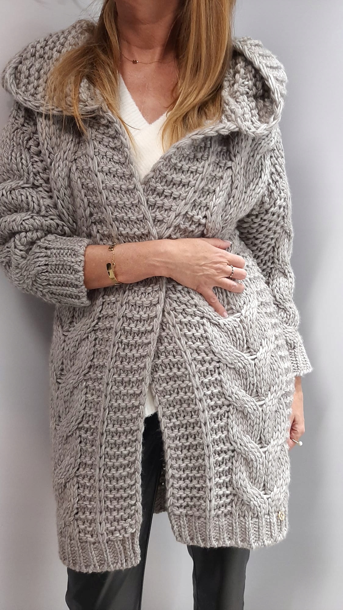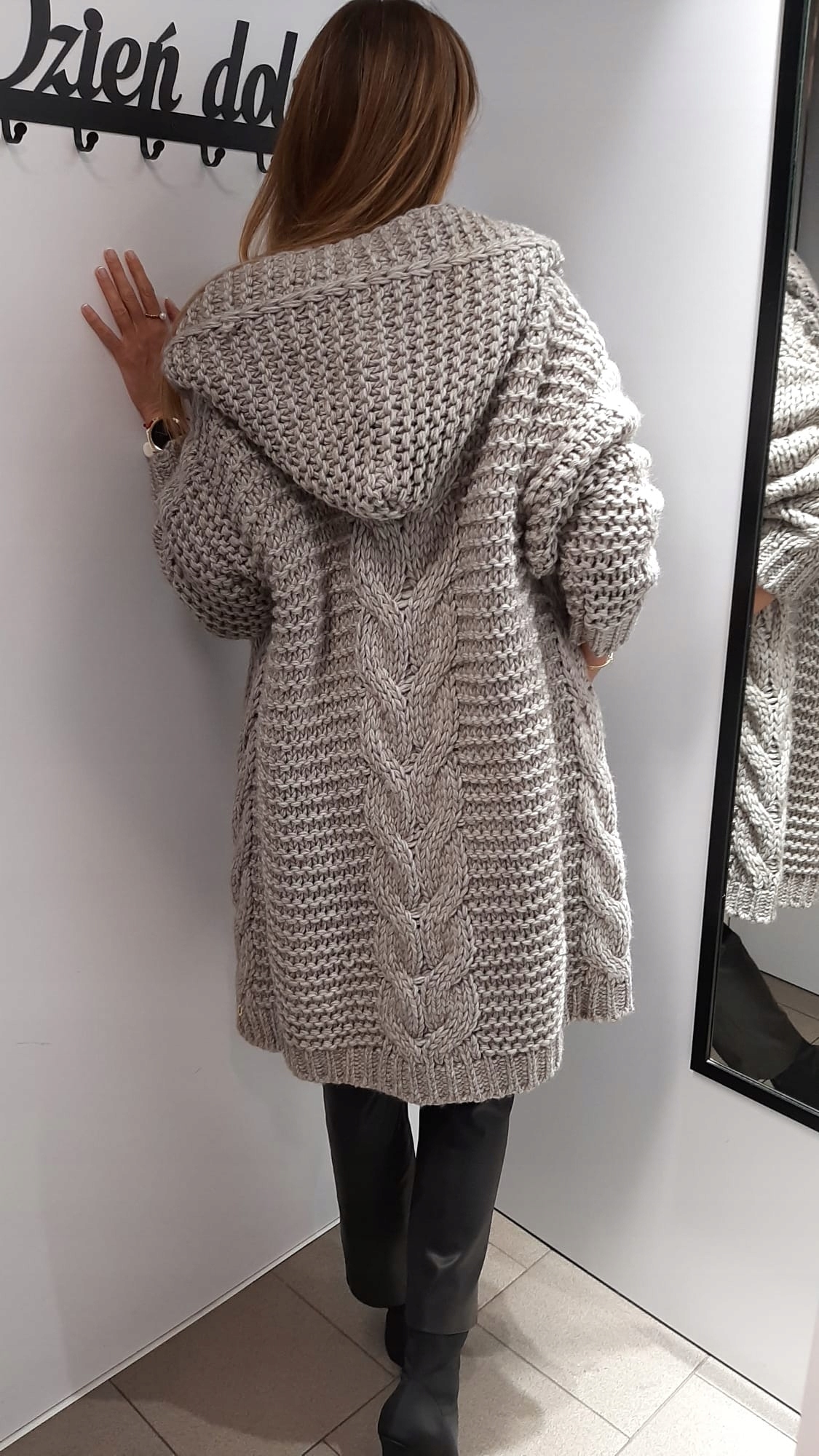 - Rewelacyjny sweterkowy płaszcz z obszernym kapturem. Wykonany z wysokiej jakości przędzy. Charakteru nadaje wyjątkowy, gruby splot