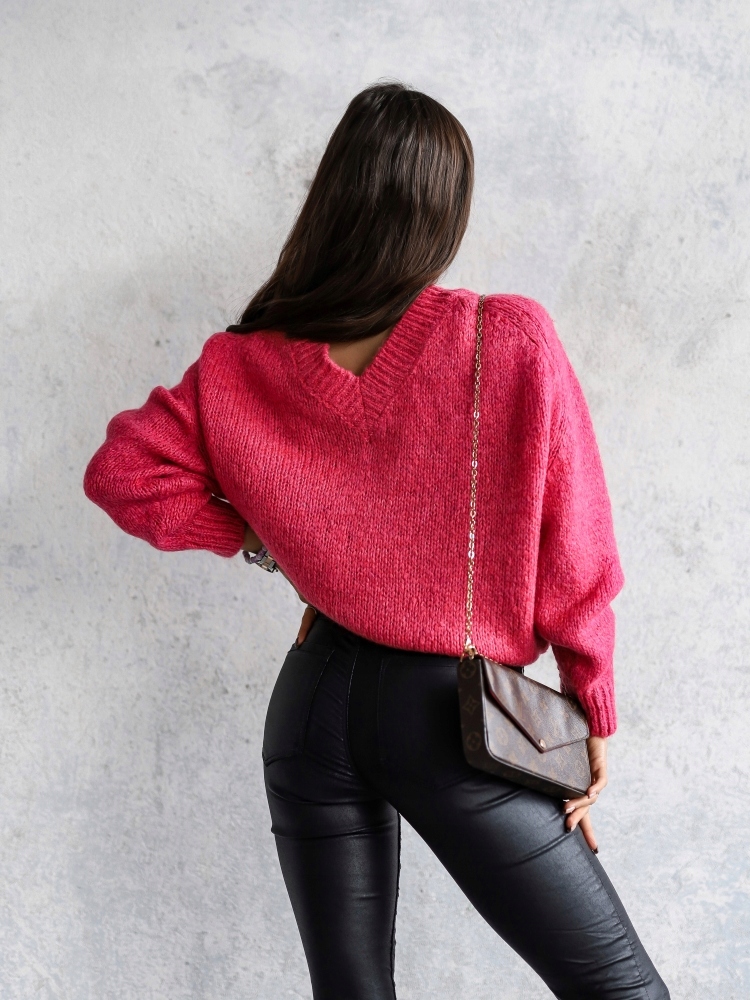 - Ponadczasowy sweterek z dekoltem V z przodu i z tyłu. Mięciutki i milutki w dotyku. Cienka włóczka