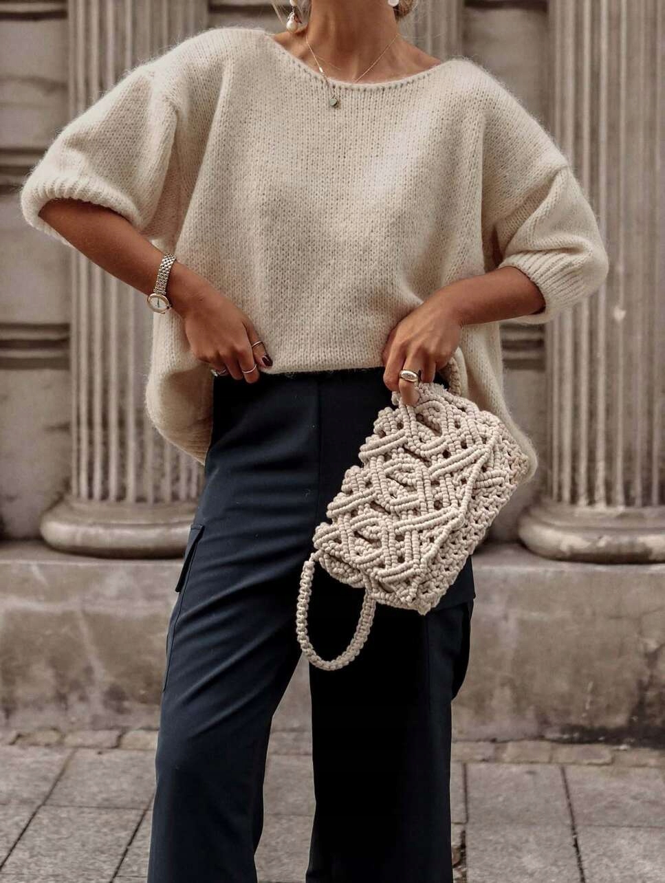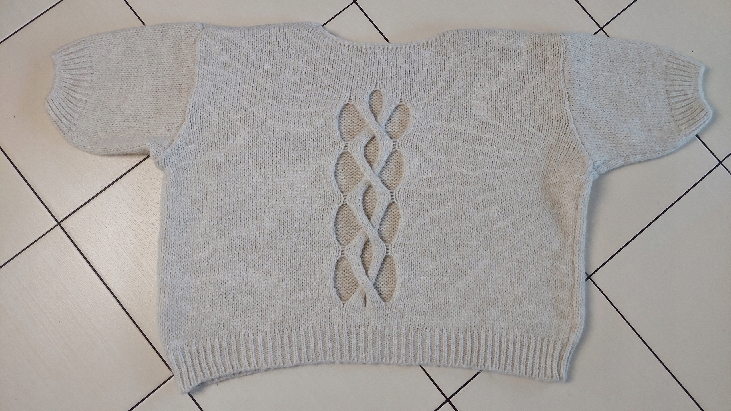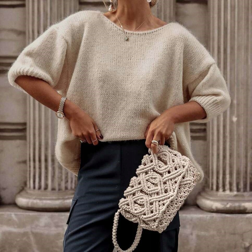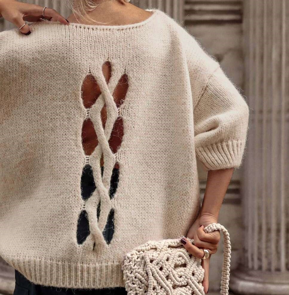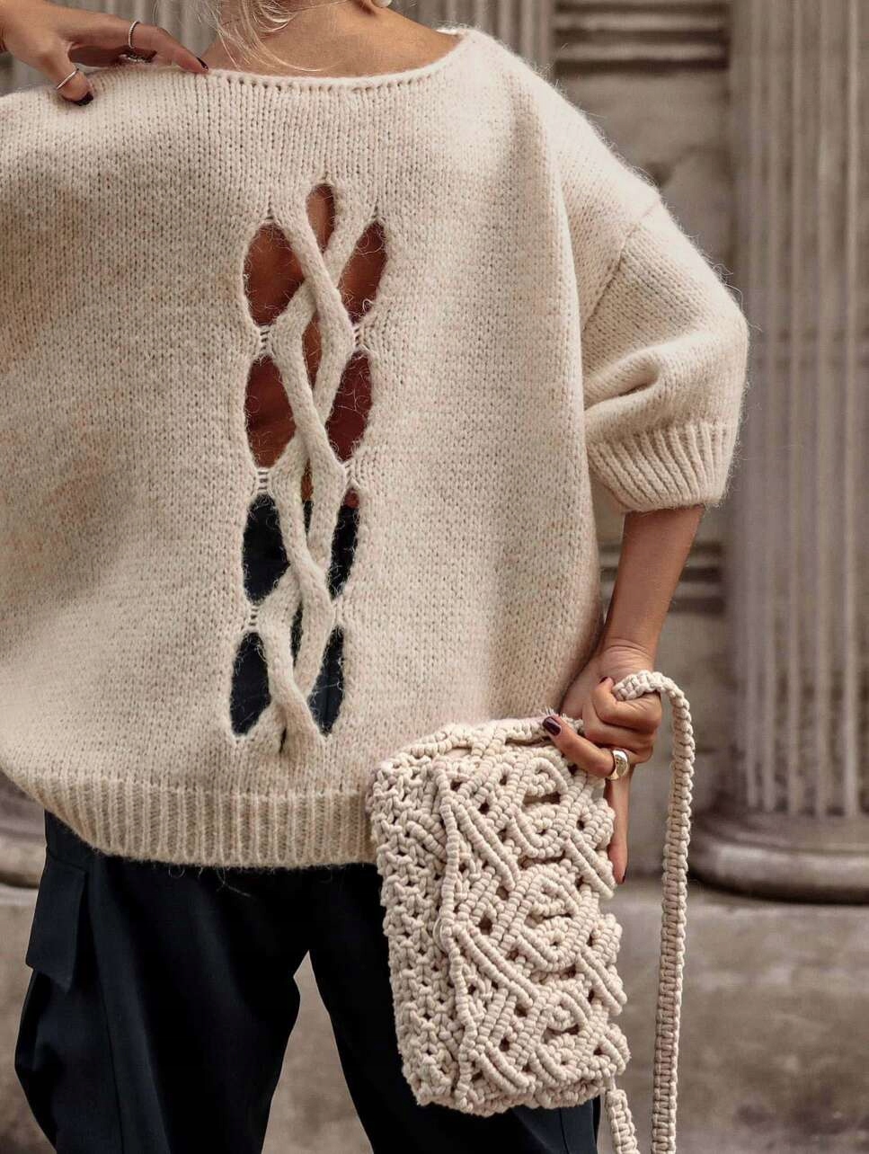 - Efektowny, luźny sweterek z ozdobnym wycięciem na plecach. Wykonany z miłego materiału u polskiego producenta.