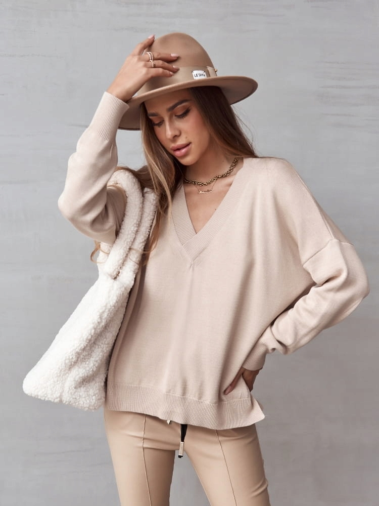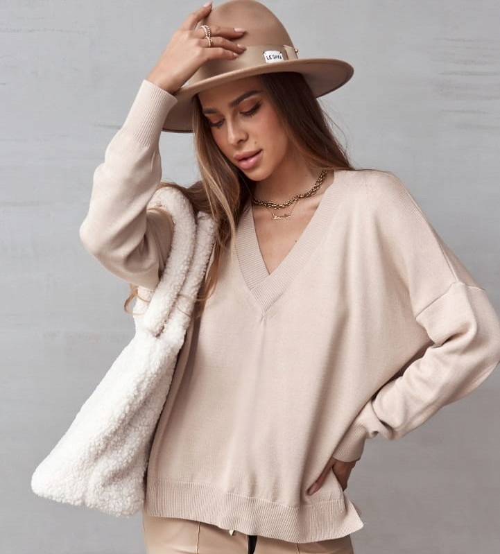 - Efektowny, luźny sweterek z kobiecym V-dekoltem. Wykonany z wysokiej jakości przędzy u polskiego producenta.
