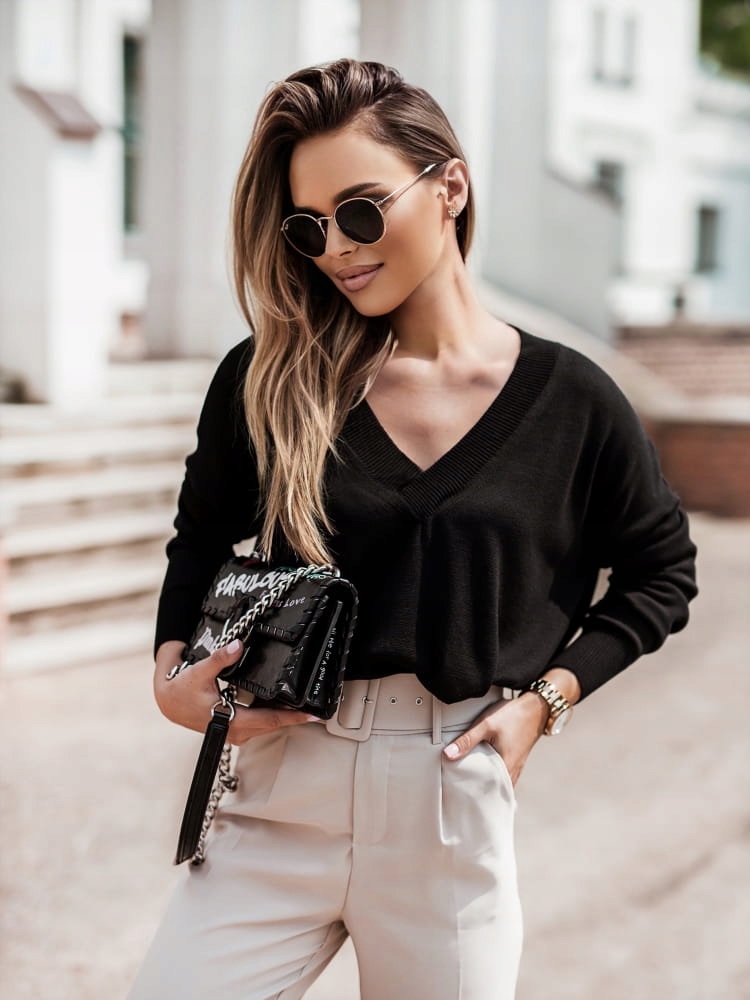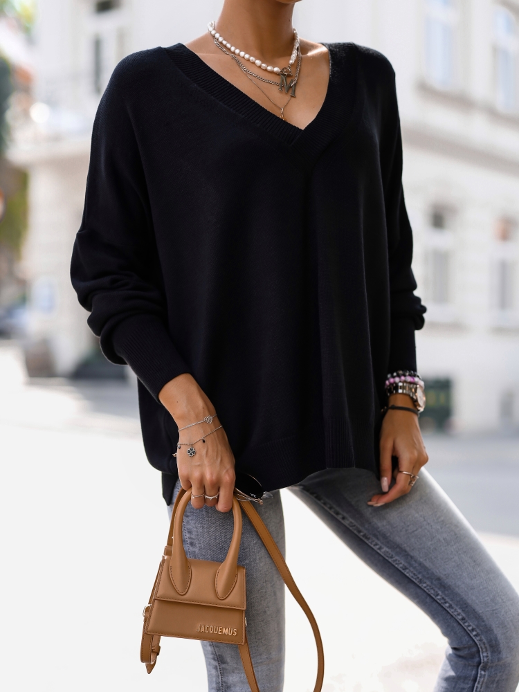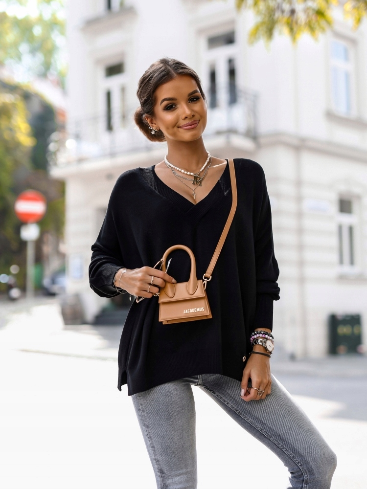 - Efektowny, luźny sweterek z kobiecym V-dekoltem. Wykonany z wysokiej jakości przędzy u polskiego producenta.