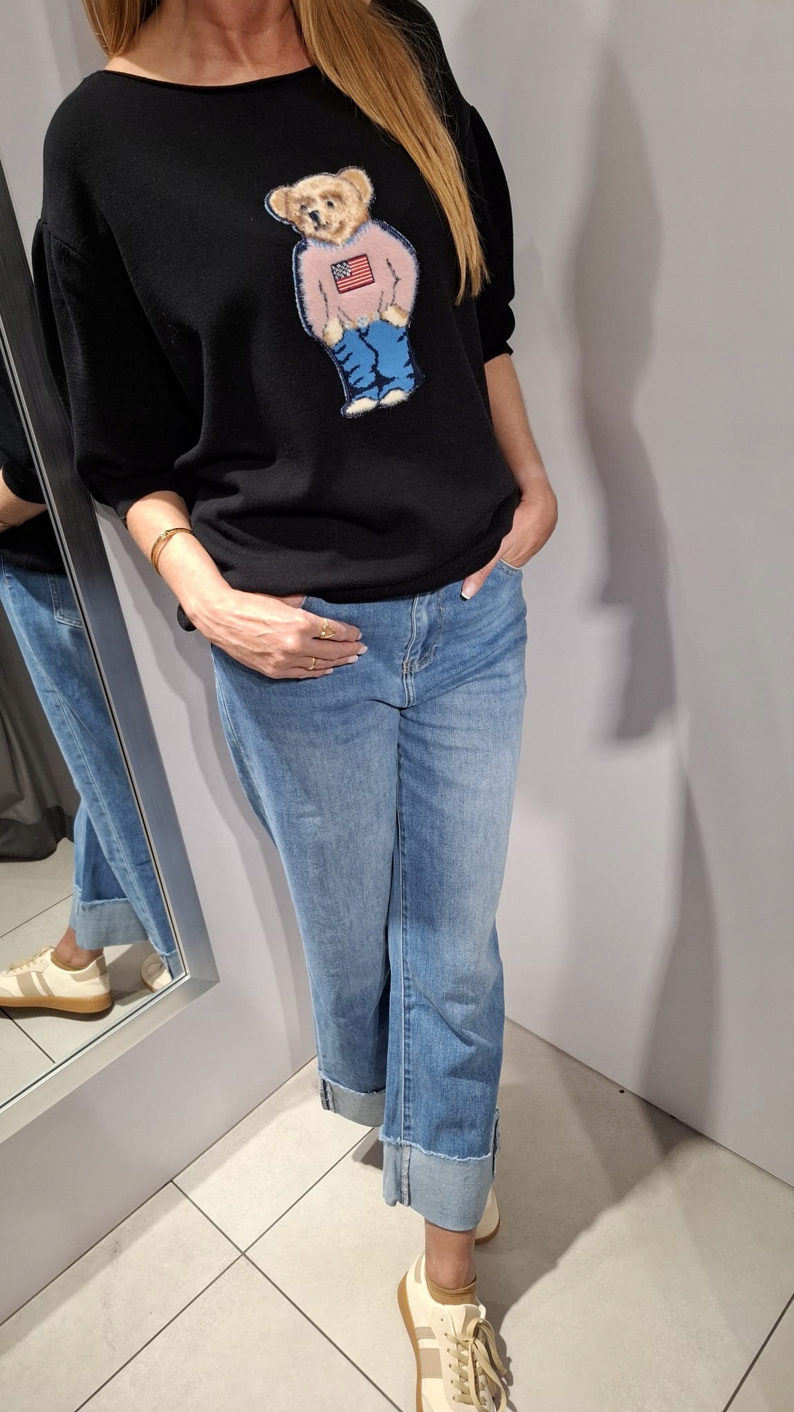 - Efektowna oversize, sweterkowa bluzka . Wykonana z wysokiej jakości dzianiny. Rękawy zakończone ściągaczem. Na przodzie ozdobna naszywka Miś