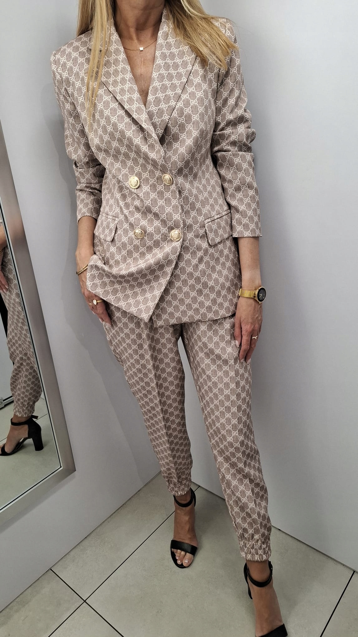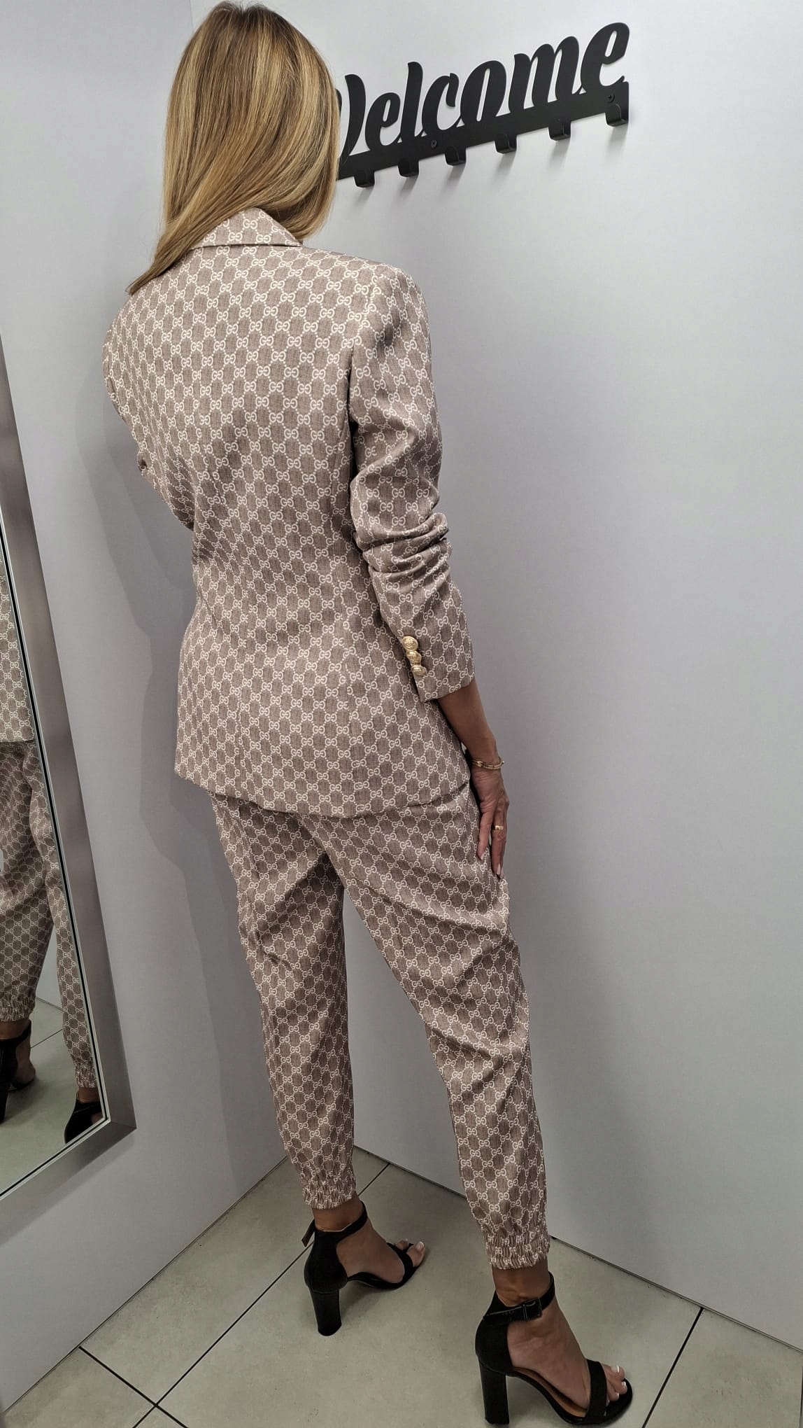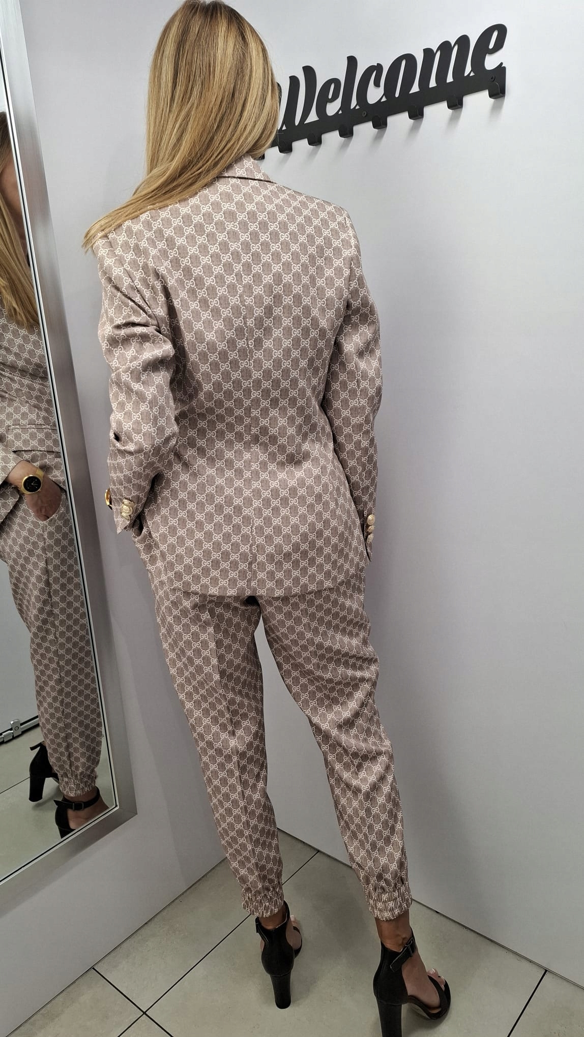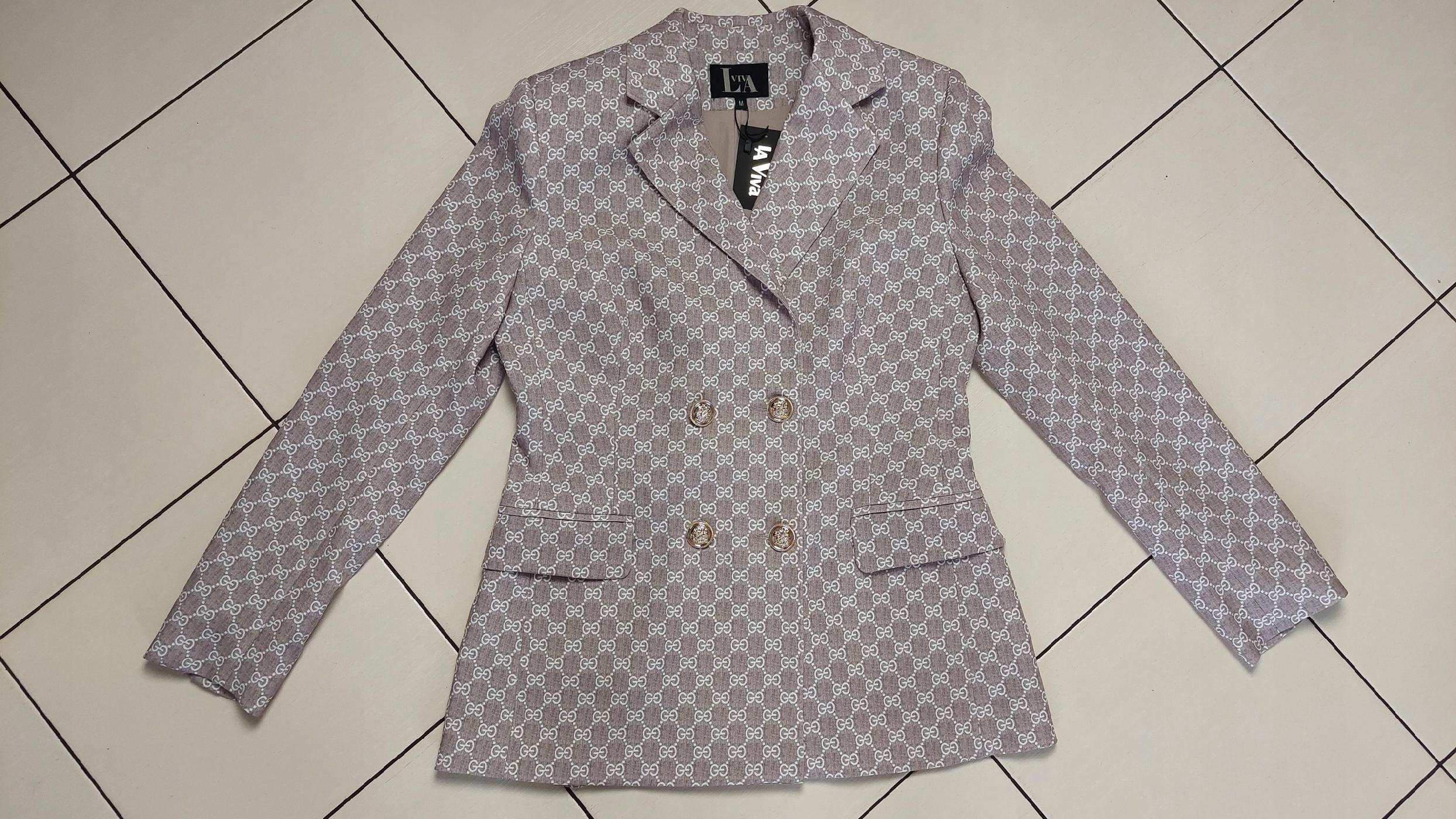 - Marynarka posiada podszewkę, ozdobne guziki, poduszki na ramionach. Taliowany krój z możliwością zmiany szerokości po przesunięciu guzików. Dwie wpuszczane kieszenie