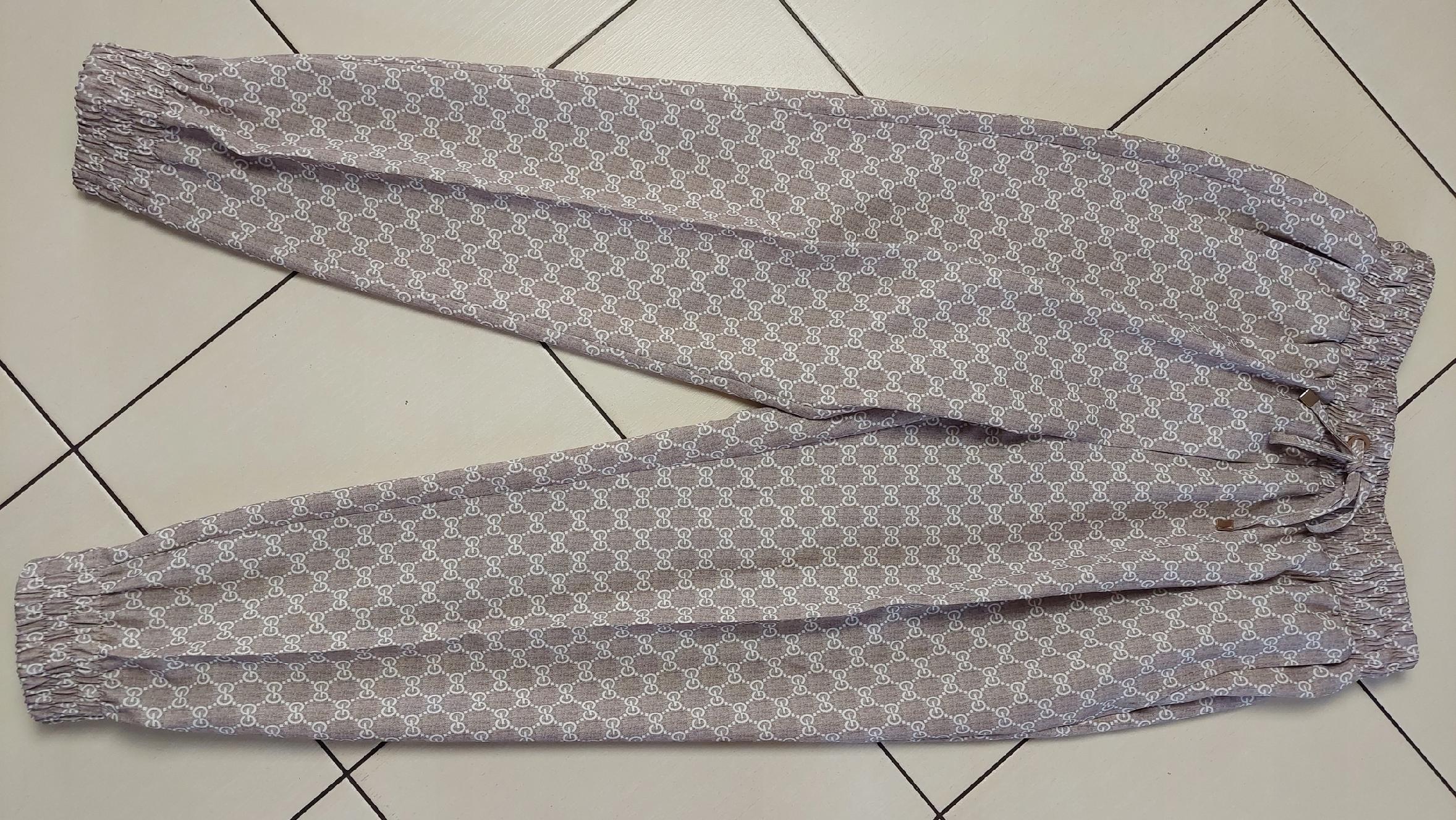 - Spodnie W pasie praktyczna gumka z dodatkowym wiązaniem , wysoki stan, kieszenie po bokach. Długość 7/8. Charakteru nadają ściągacze na dole nogawek
