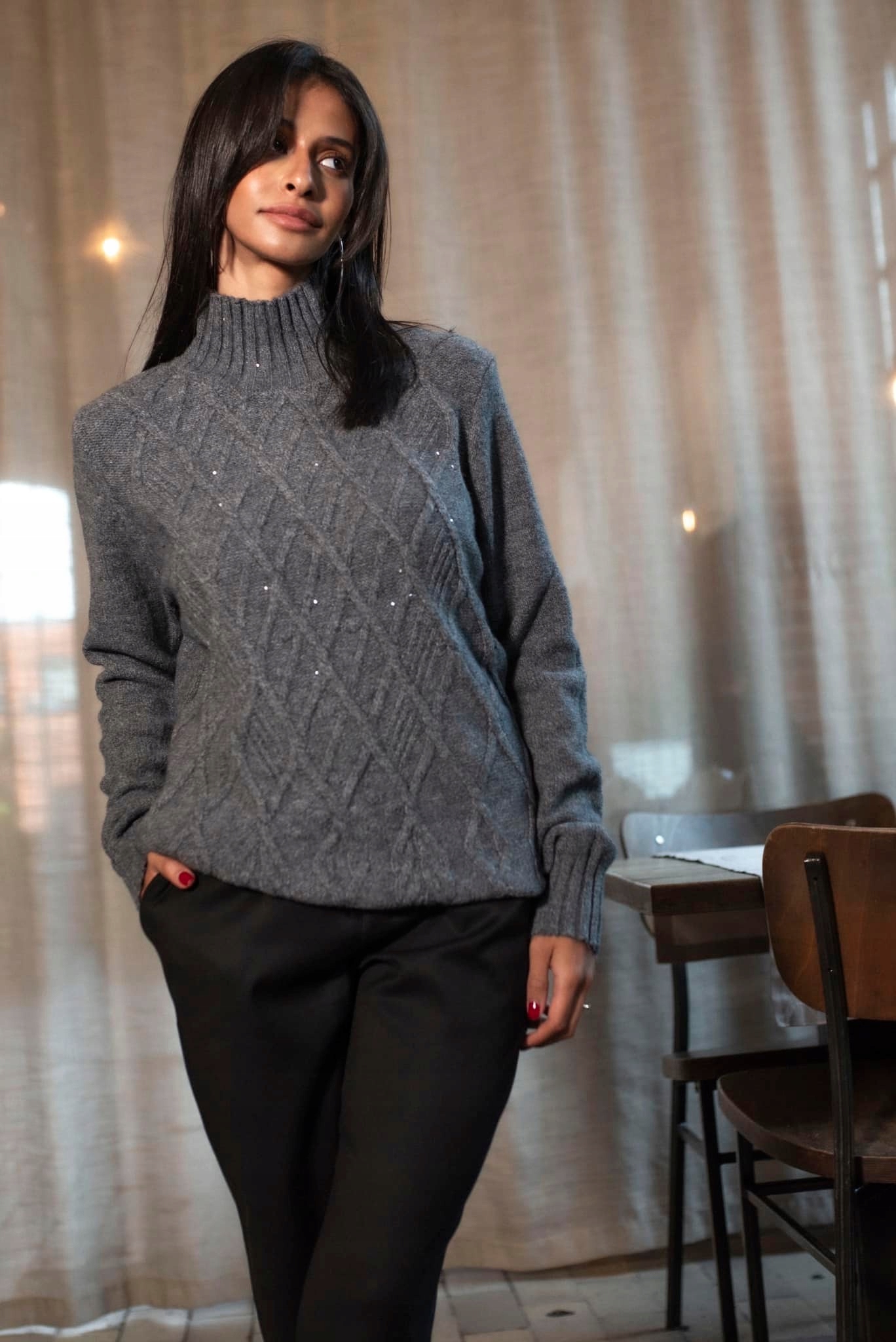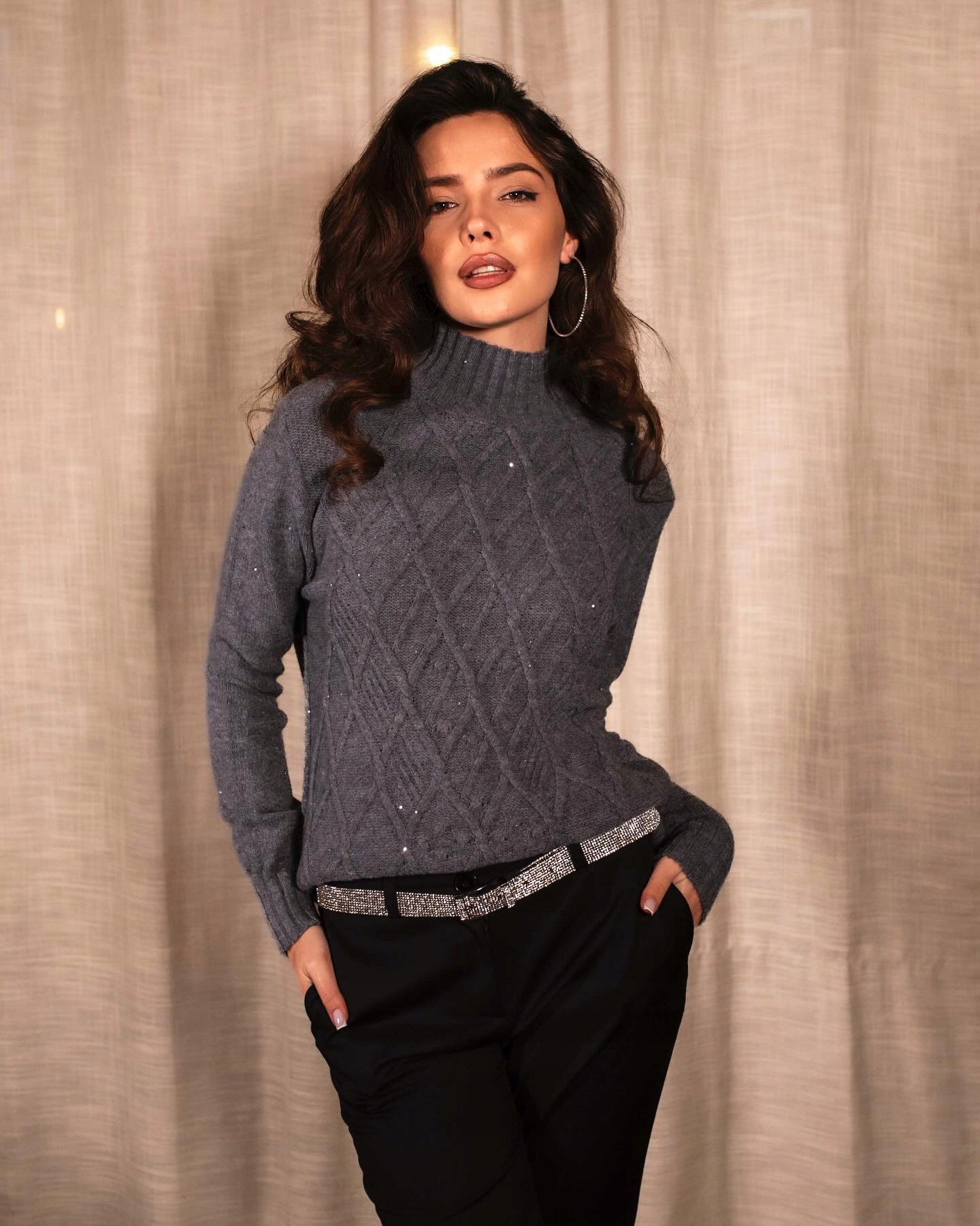 - Klasyczny półgolf. Wykonany z wysokiej jakości, elastycznego materiału. Ozdobiony subtelnymi, malutkimi cekinami, które są przyszywane. Miły i miękki w dotyku. Charakteru nadaje wzór na przodzie