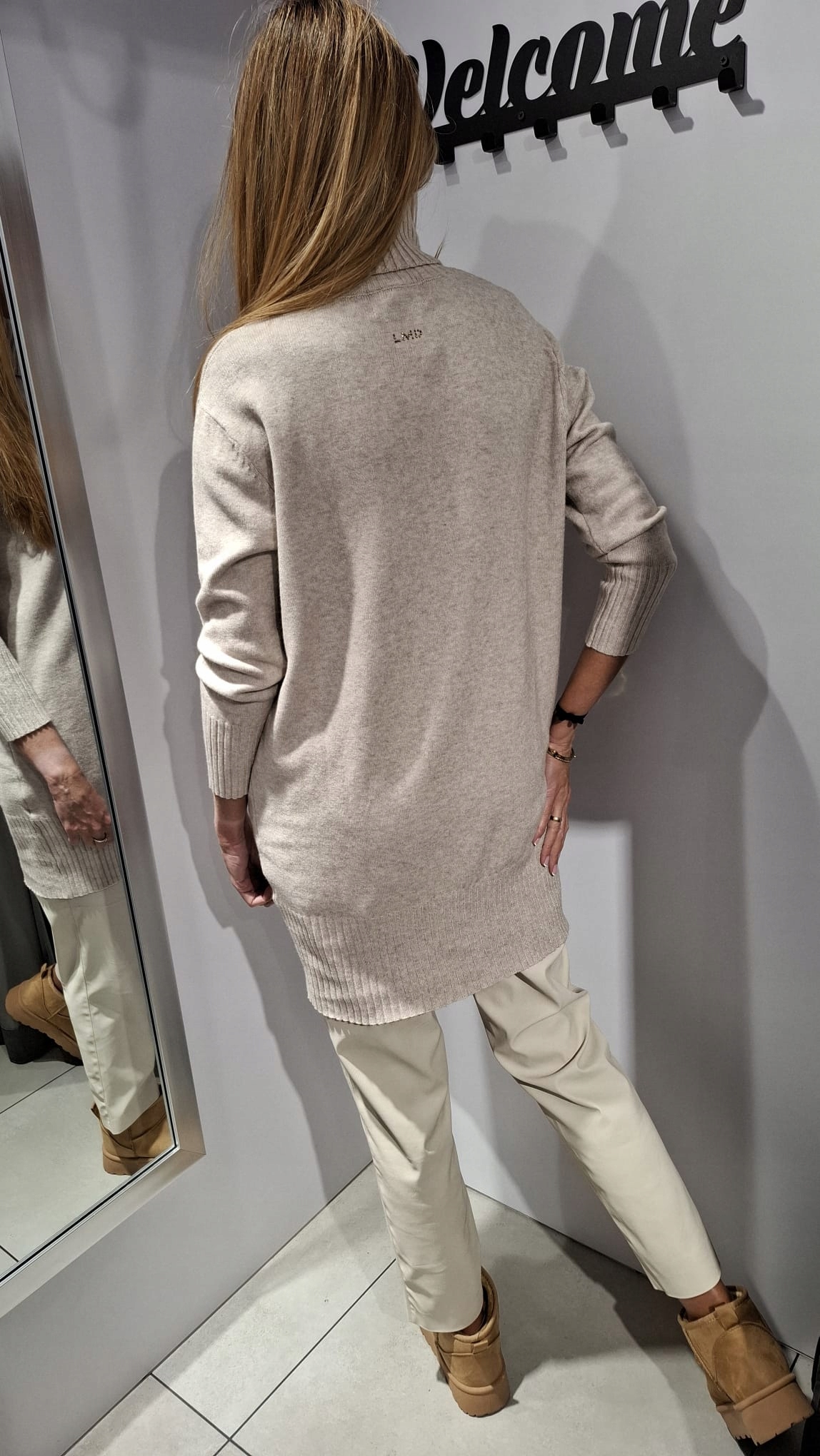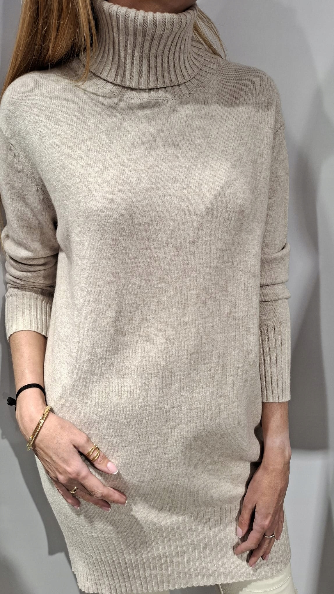 - Rewelacyjny długi sweter z golfem. Wykonany z wysokiej jakości, elastycznego materiału. Miły i miękki w dotyku. Na plecach delikatne logo producenta
