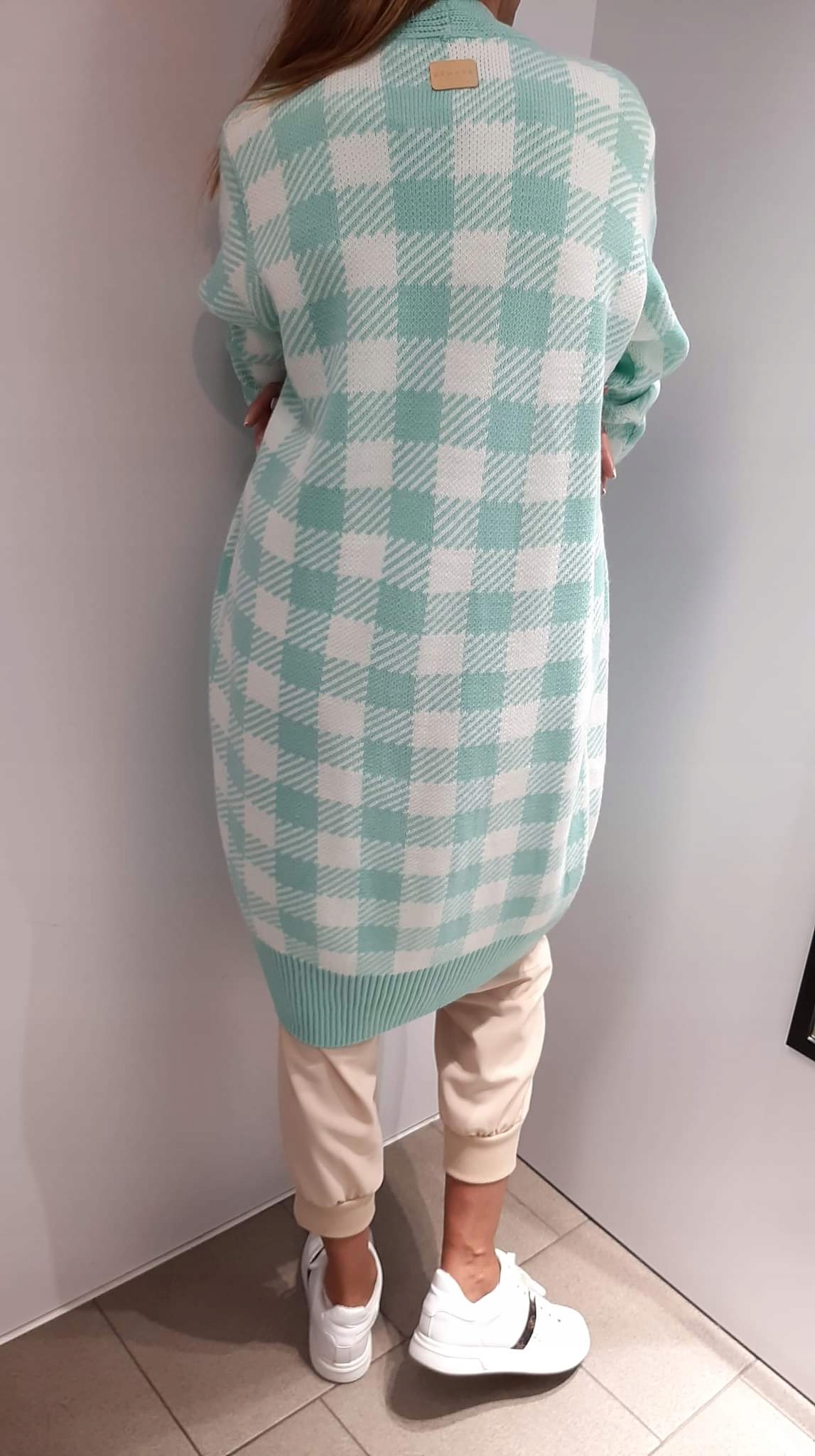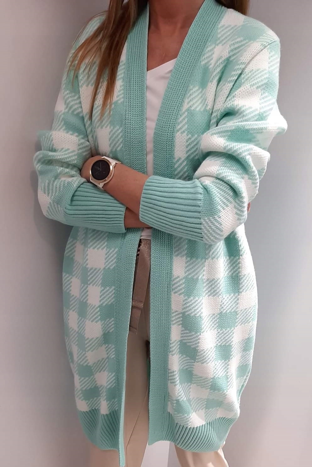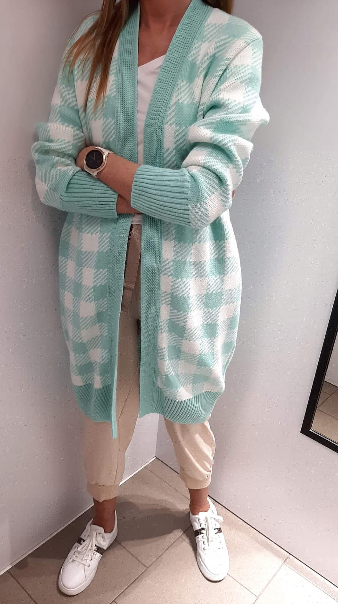 Sweter Kardigan SEMPRE Turkusowy + Ecru Kratka