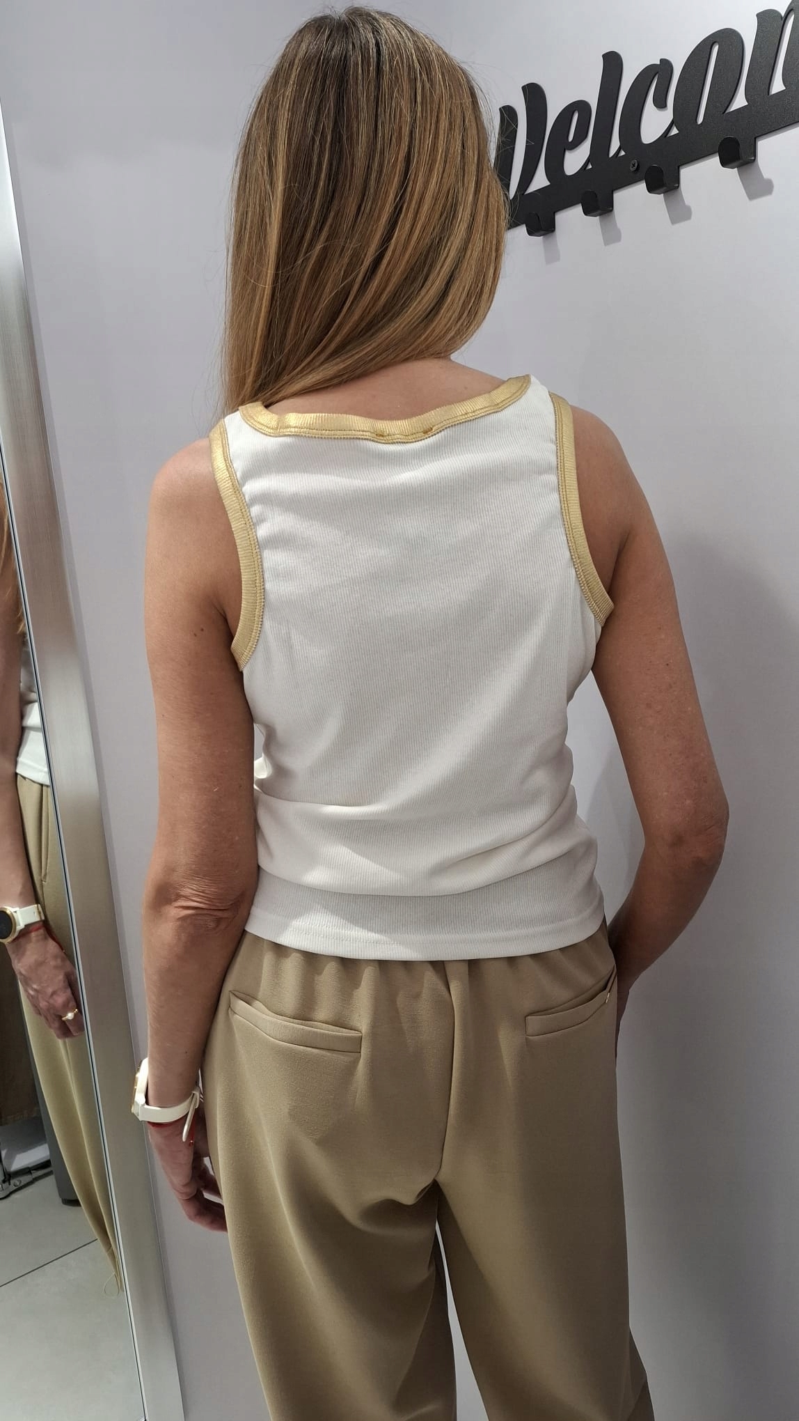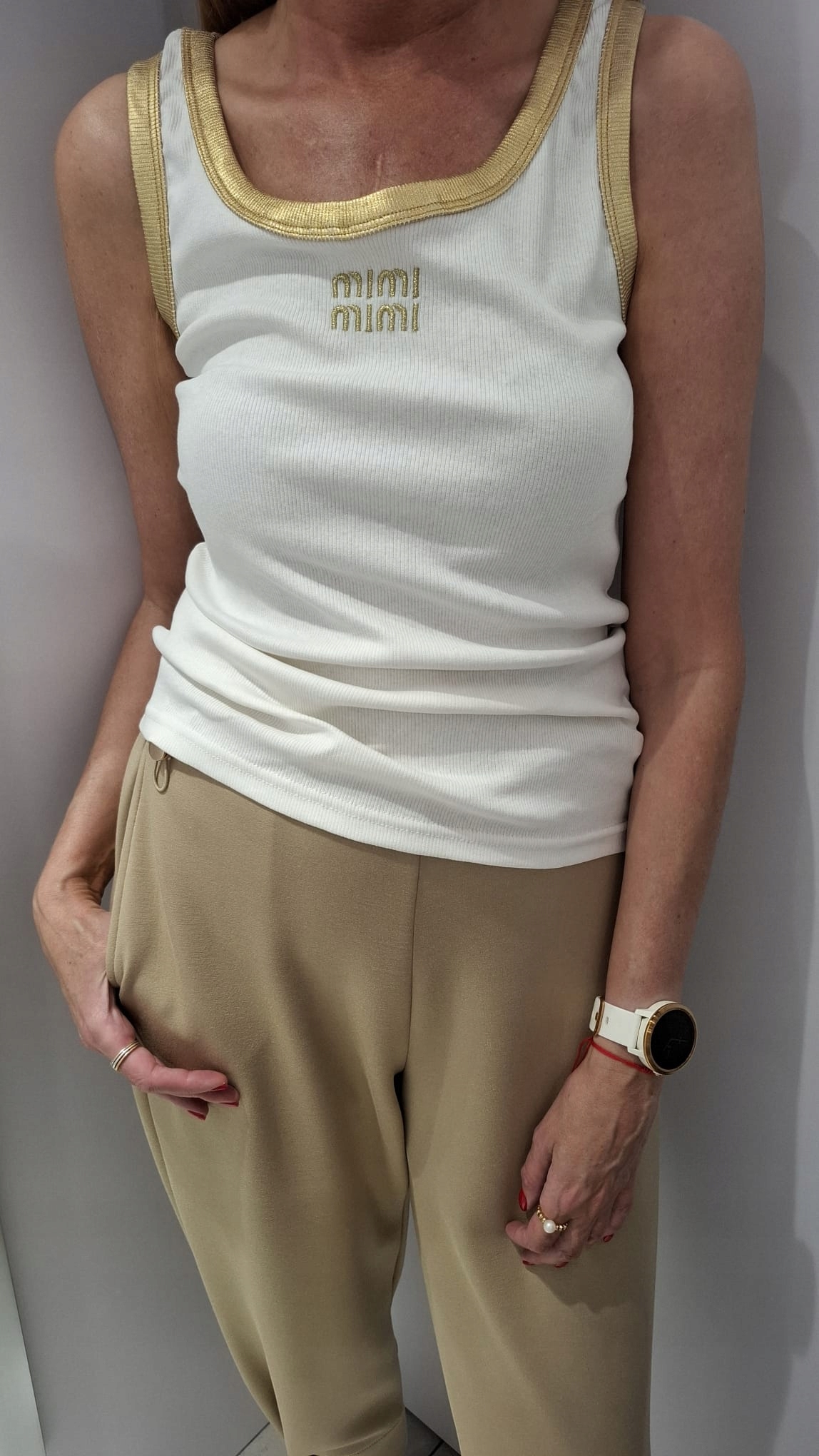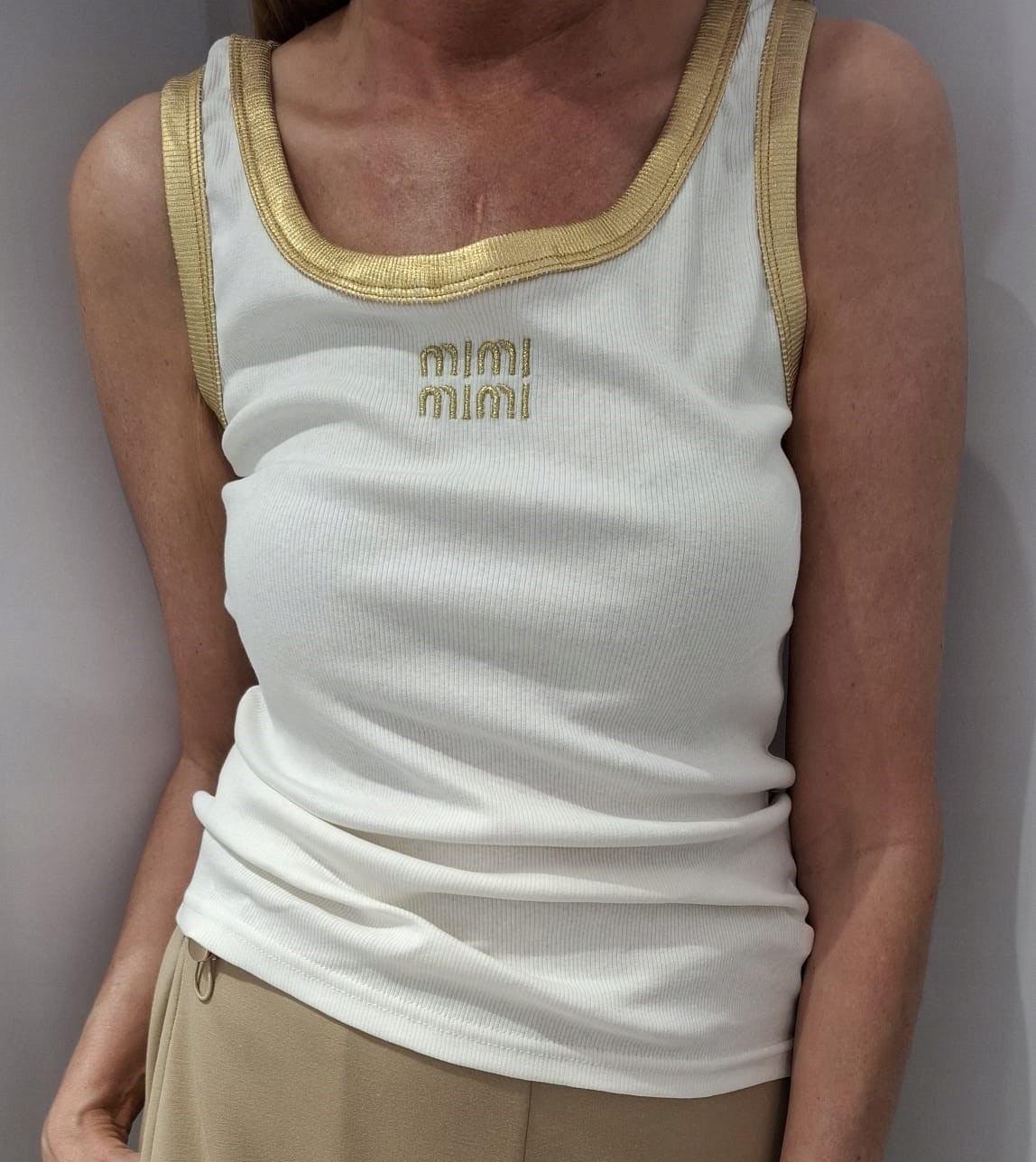 - Rewelacyjna bluzka na ramiączkach. Wykonana z prążkowanego materiału. Na przodzie znajduje się haftowany napis MIMI. Charakteru nadają złote wykończenia