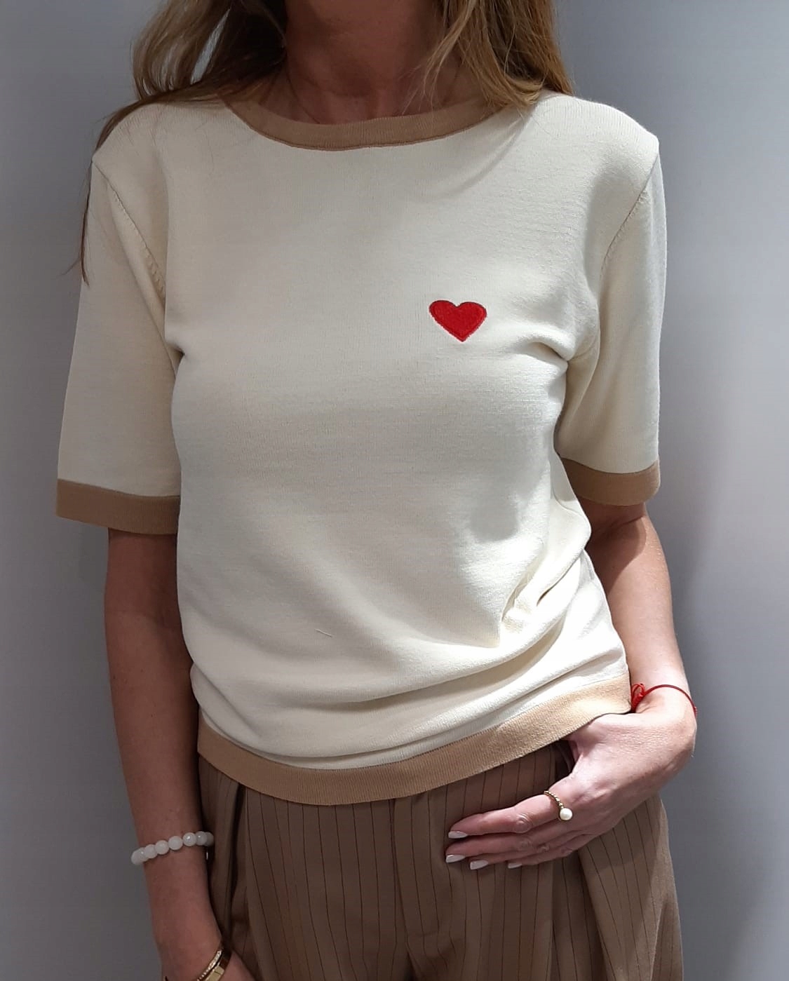 - Sweterkowa bluzka. Wykonana z wysokiej jakości, elastycznego materiału. Klasyczny krój zapewni wygodę. Na przodzie czerwone, haftowane serduszko