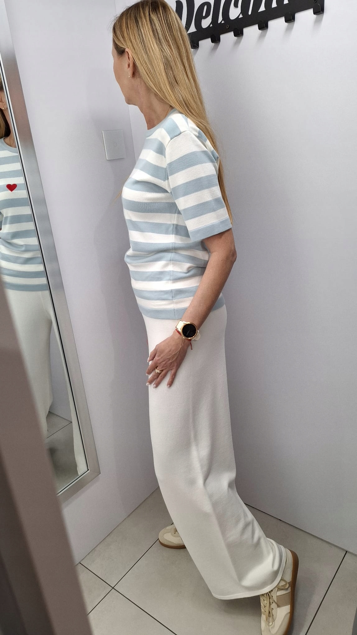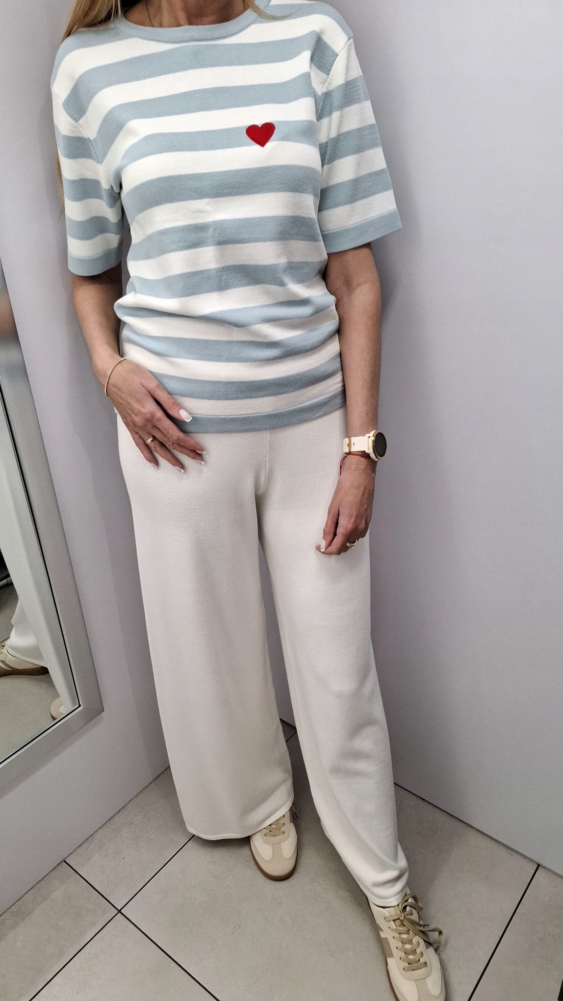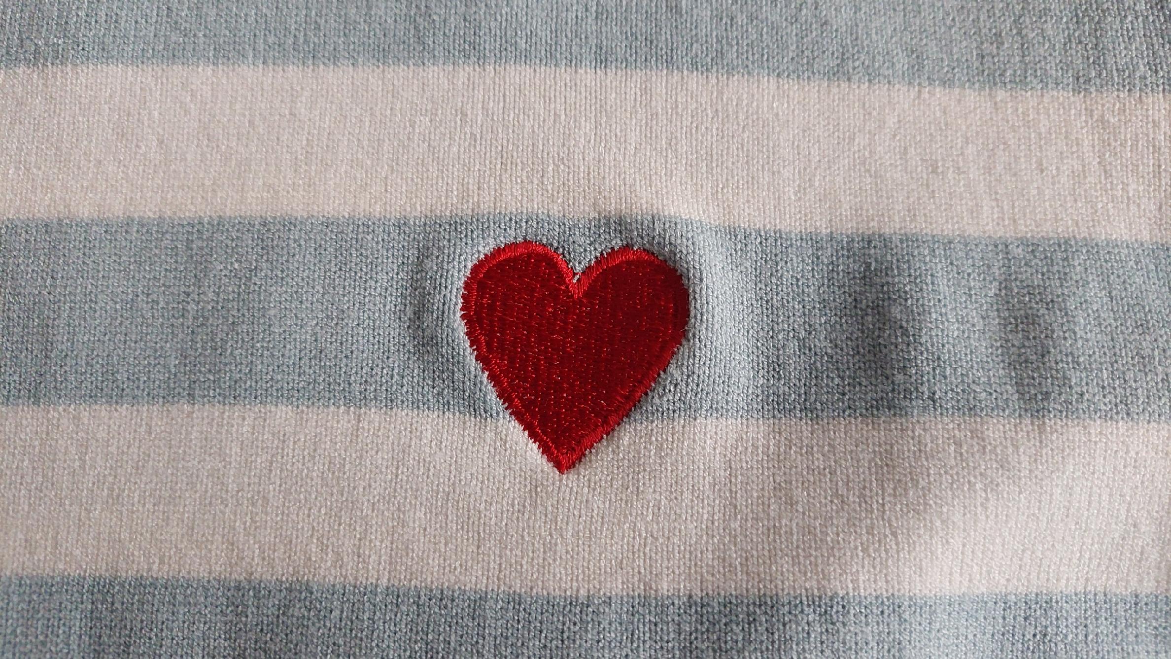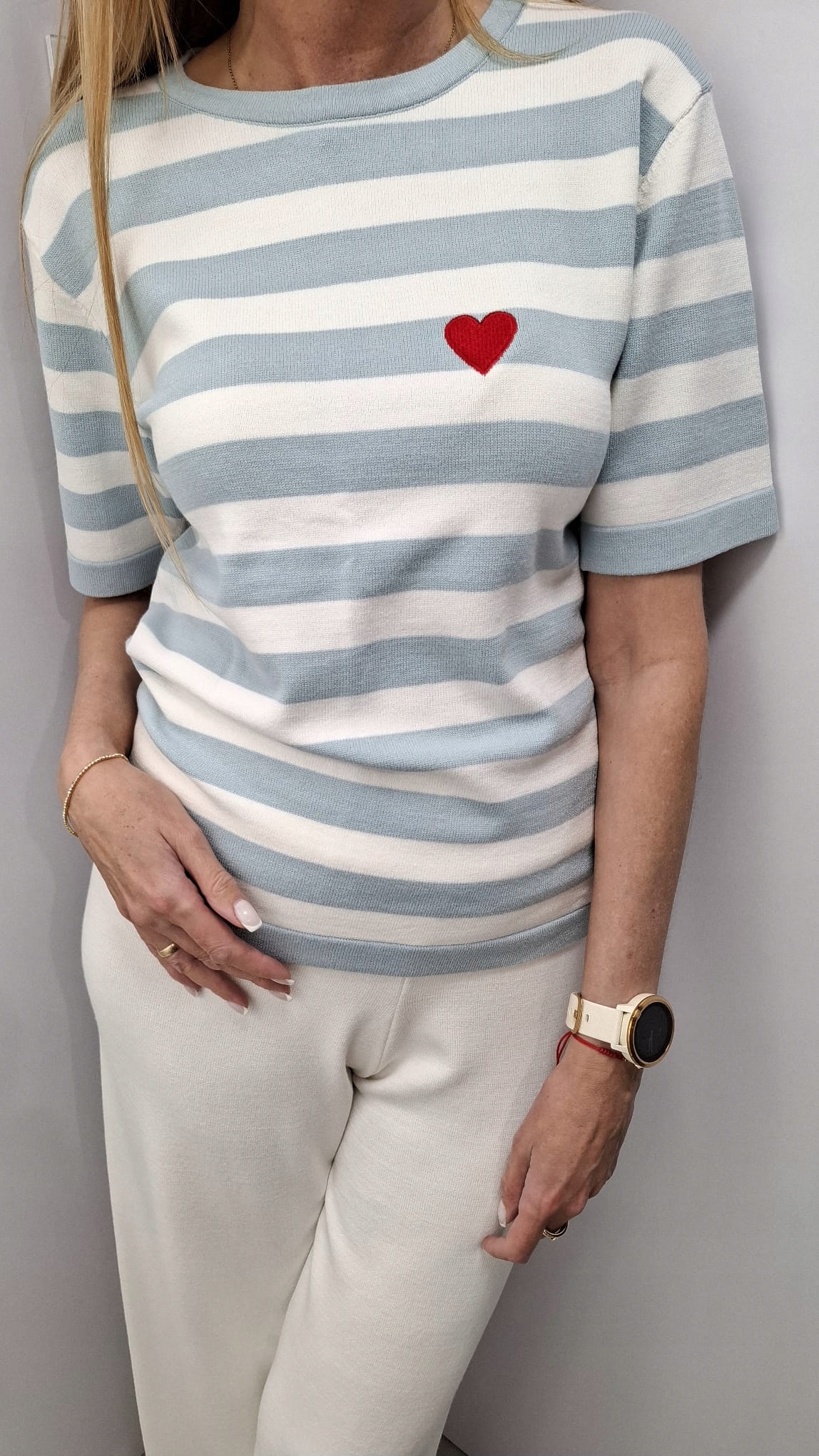 - Sweterkowa bluzka w paski. Wykonana z wysokiej jakości, elastycznego materiału. Klasyczny krój zapewni wygodę. Na przodzie czerwone, haftowane serduszko