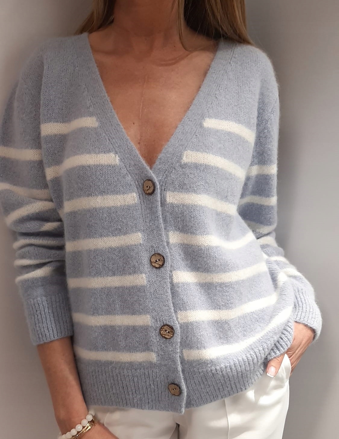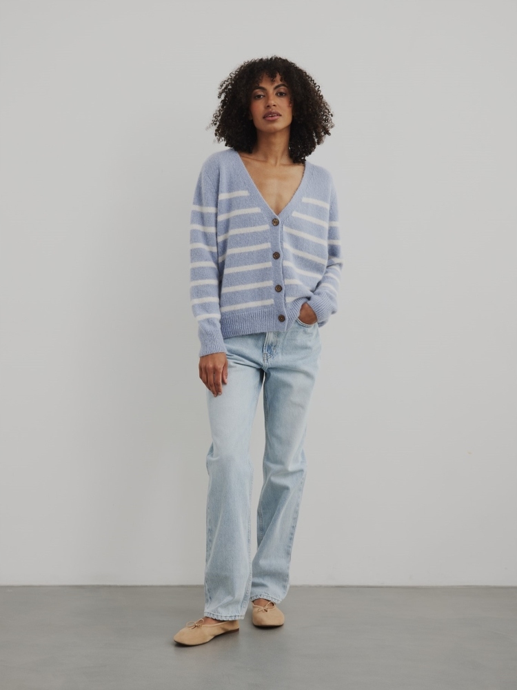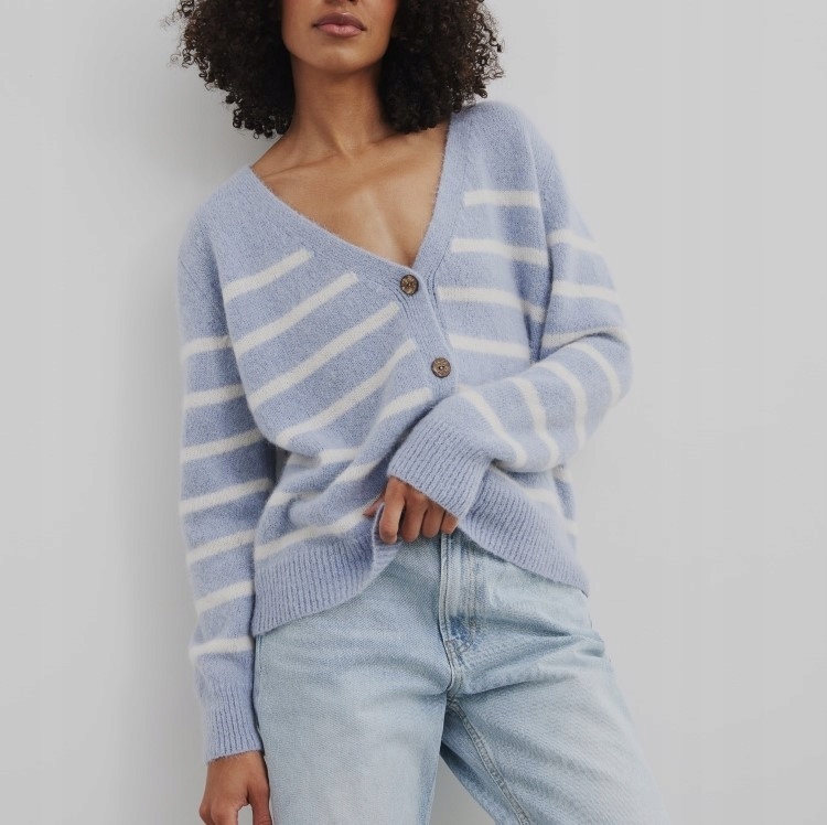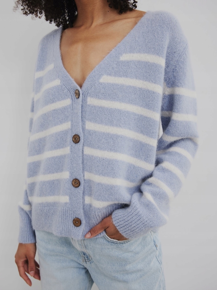 - Rewelacyjny kardigan w paski, zapinany na guziki. Wykonany z najwyższej jakości materiału. Dodatkowym atutem jest szeroki dekolt V.
