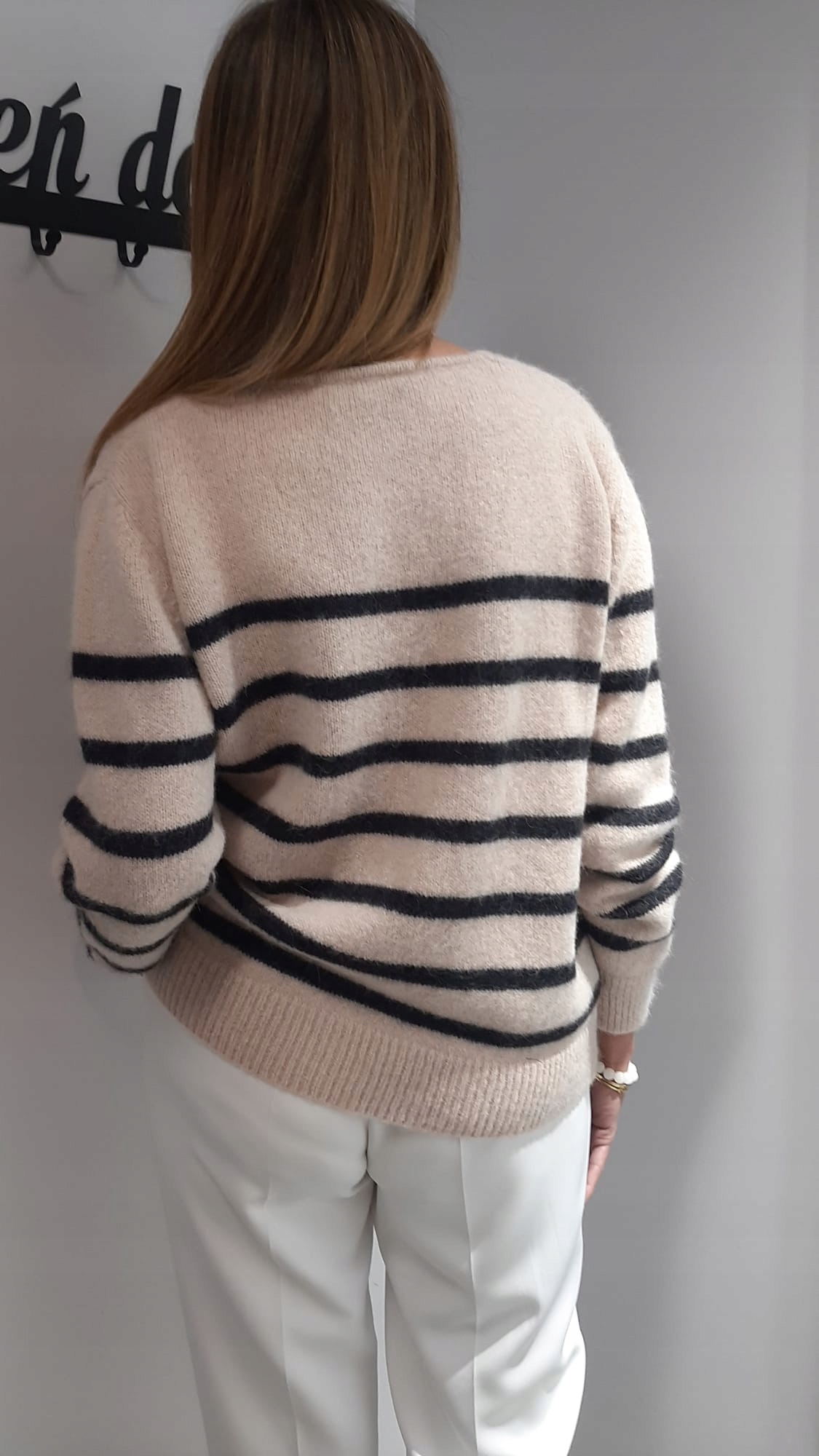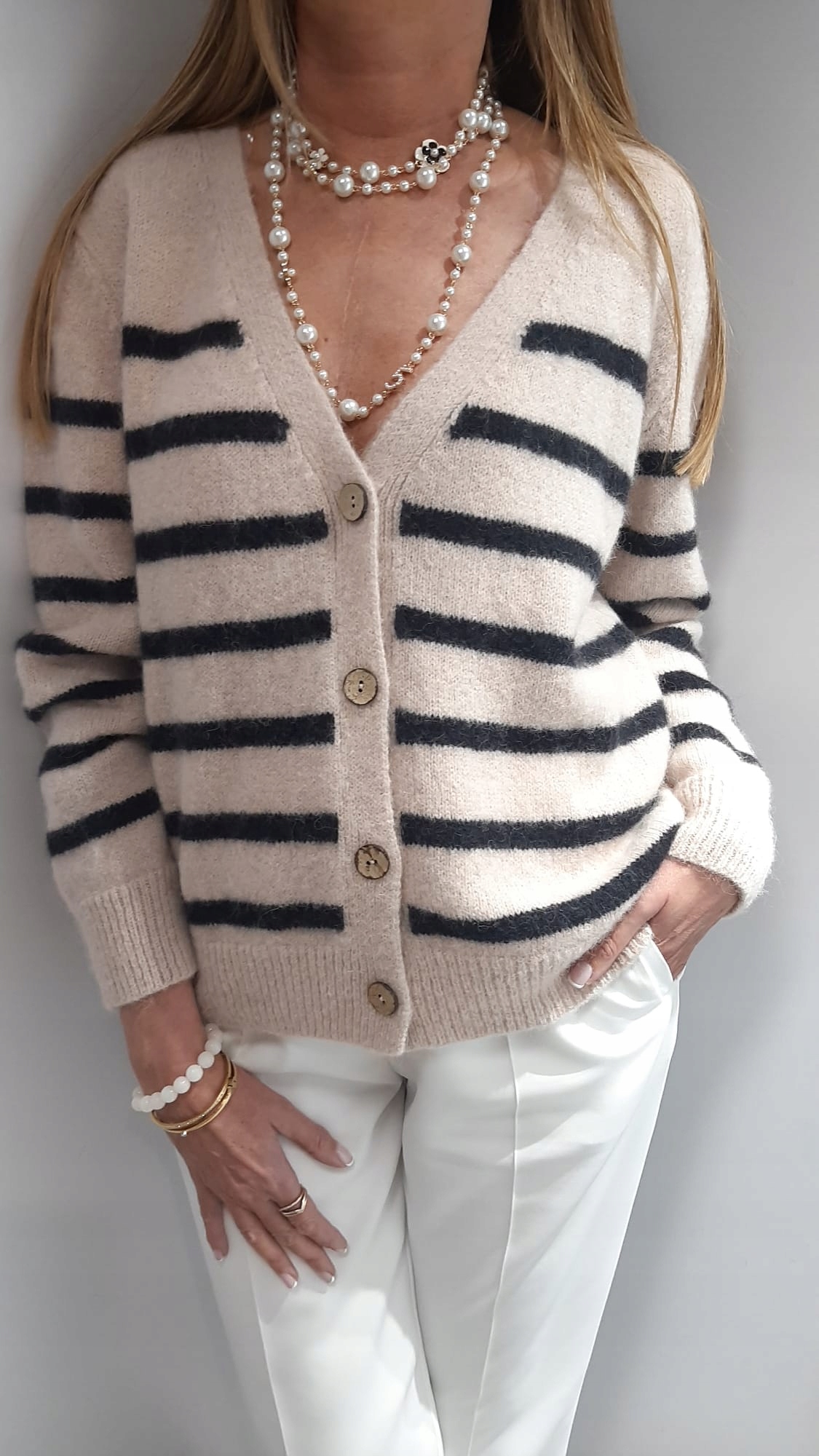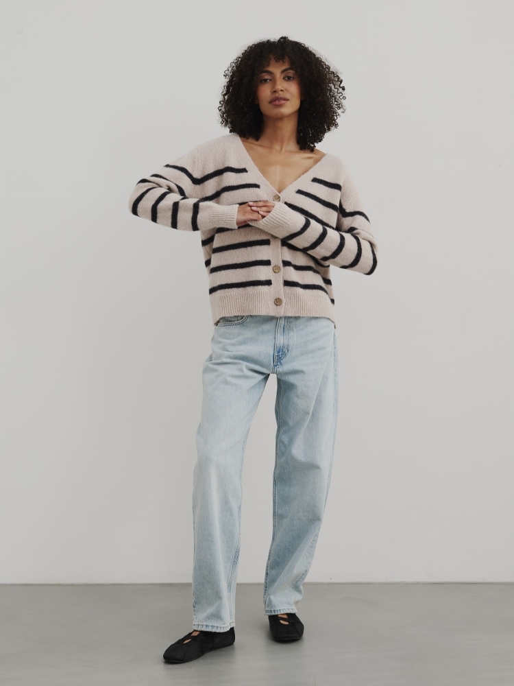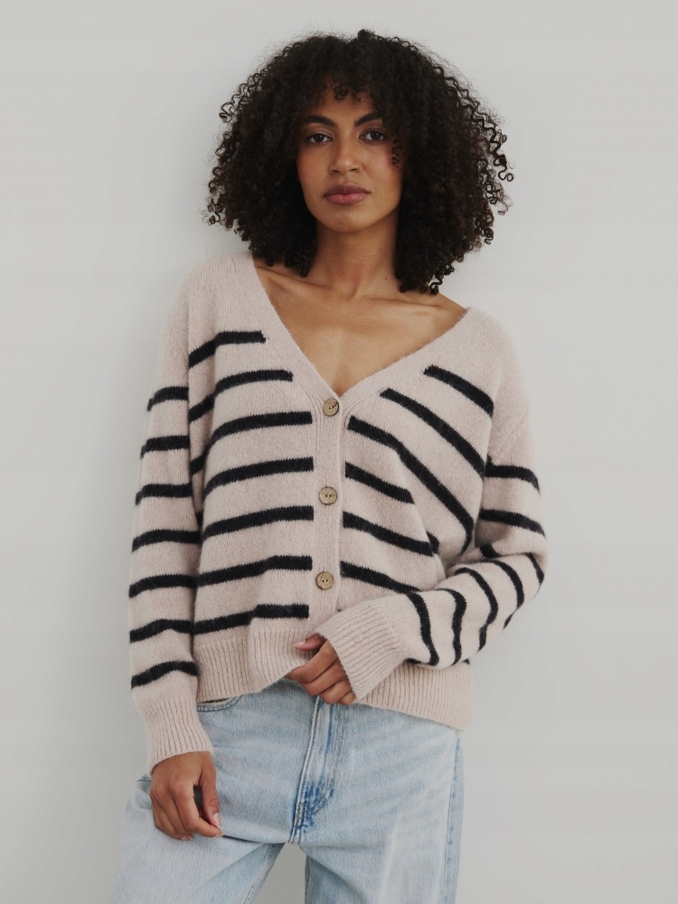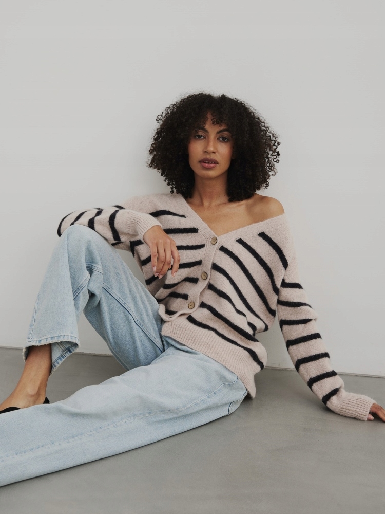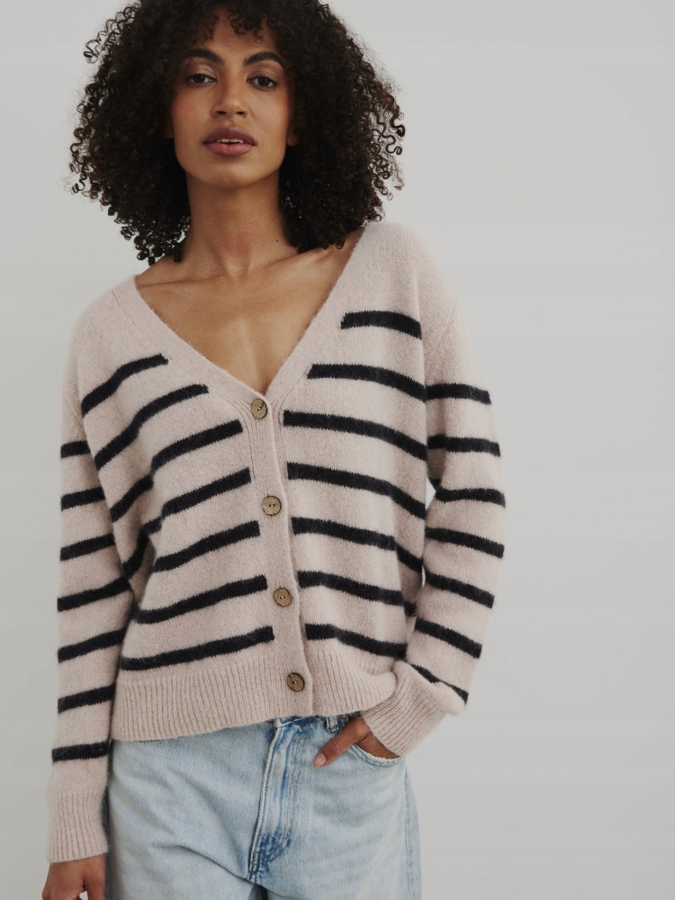 - Rewelacyjny kardigan w paski, zapinany na guziki. Wykonany z najwyższej jakości materiału. Dodatkowym atutem jest szeroki dekolt V.