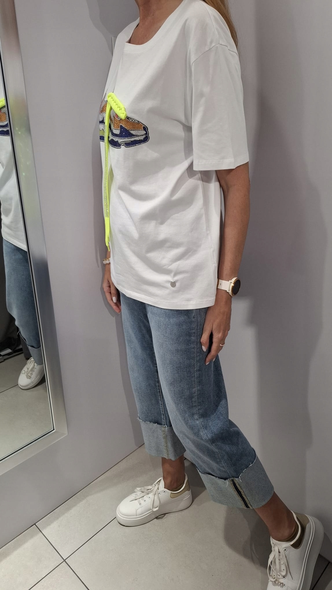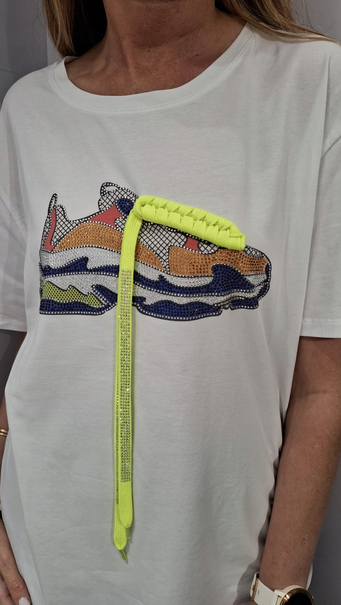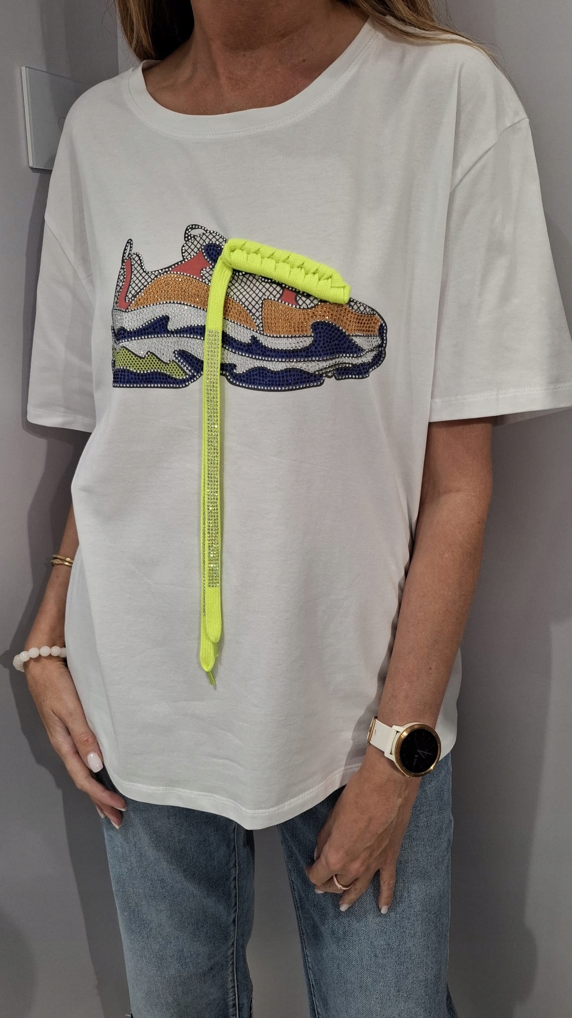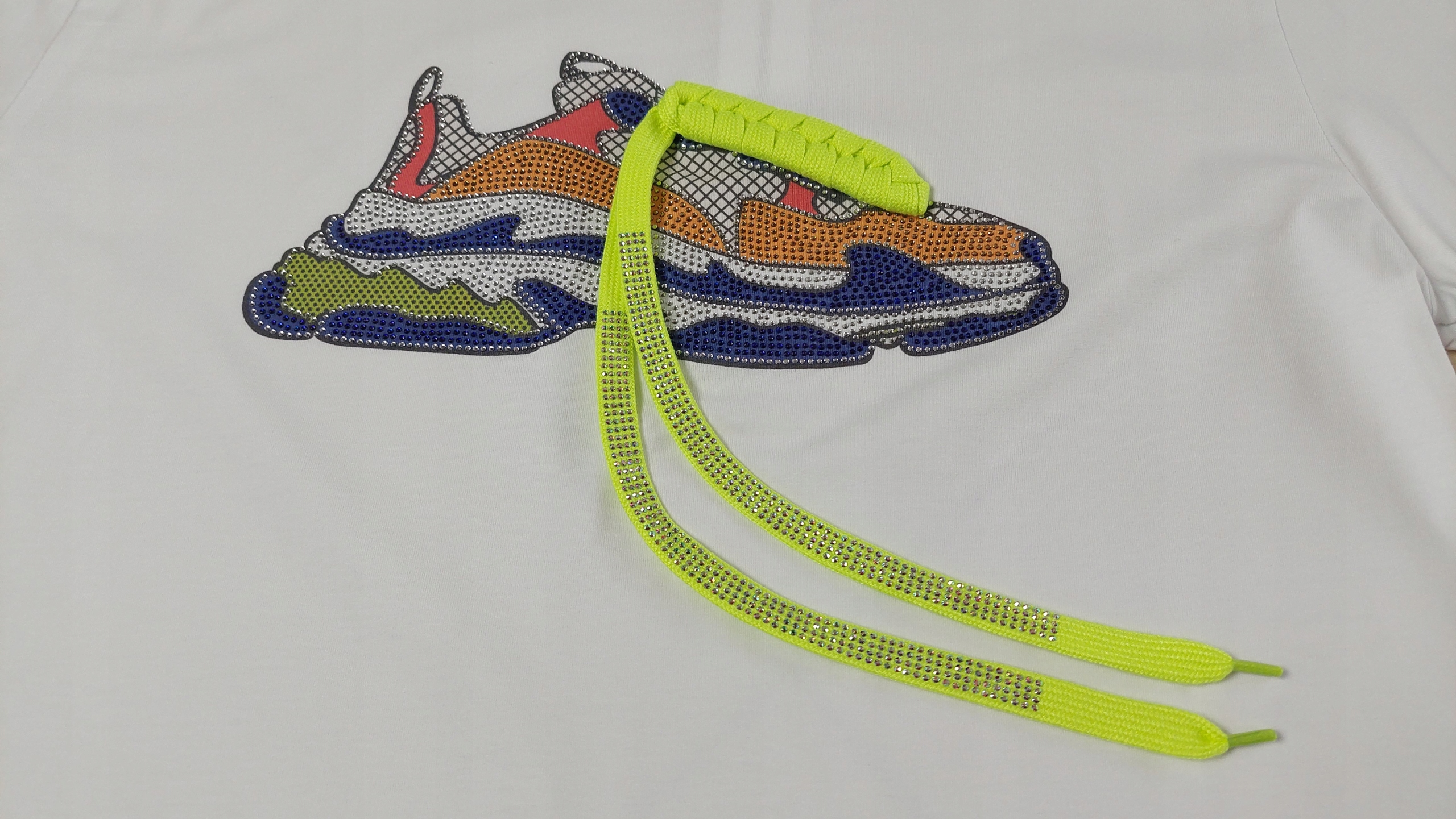 - Oryginalna t-shirt. Wykonany z wysokiej jakości materiału. Na przodzie Aplikacja w kształcie buta. Luźny krój zapewni wygodę.