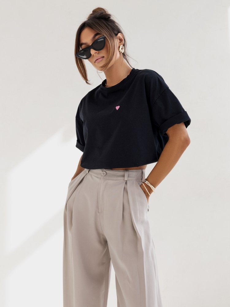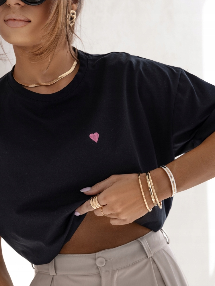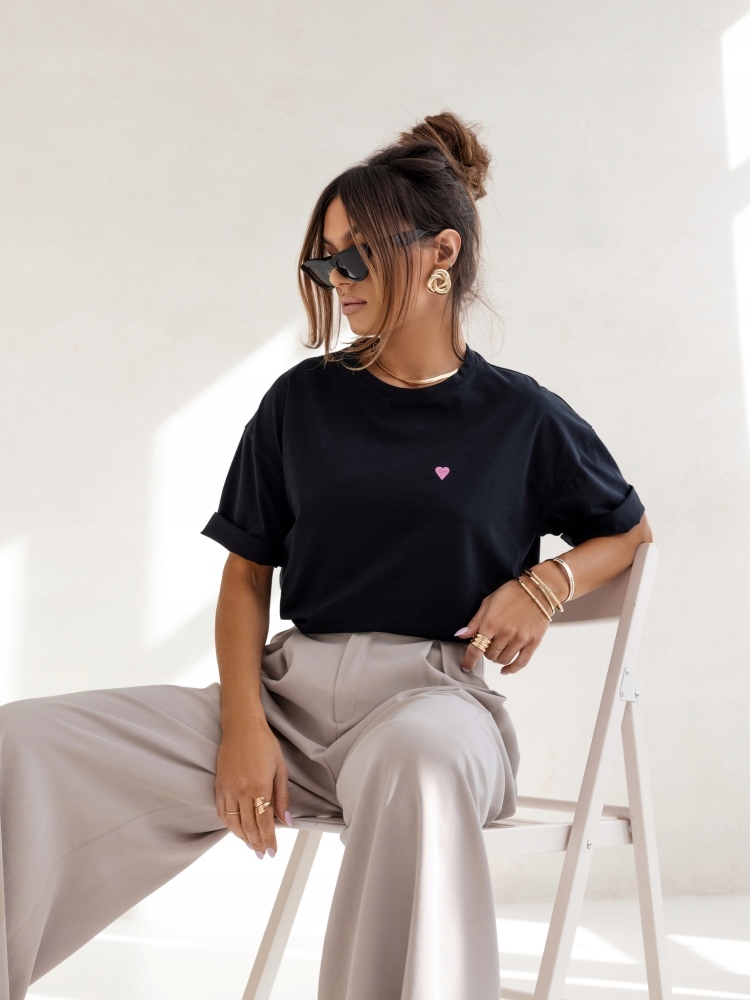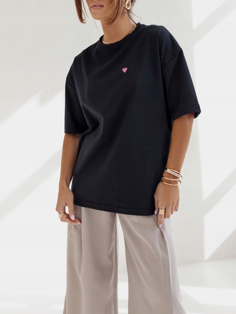 - Luźna bluzka, wykonana z wysokiej jakości materiału. Okrągły dekolt. Na przodzie znajduje się haft w kształcie serca. Szeroki, oversize krój