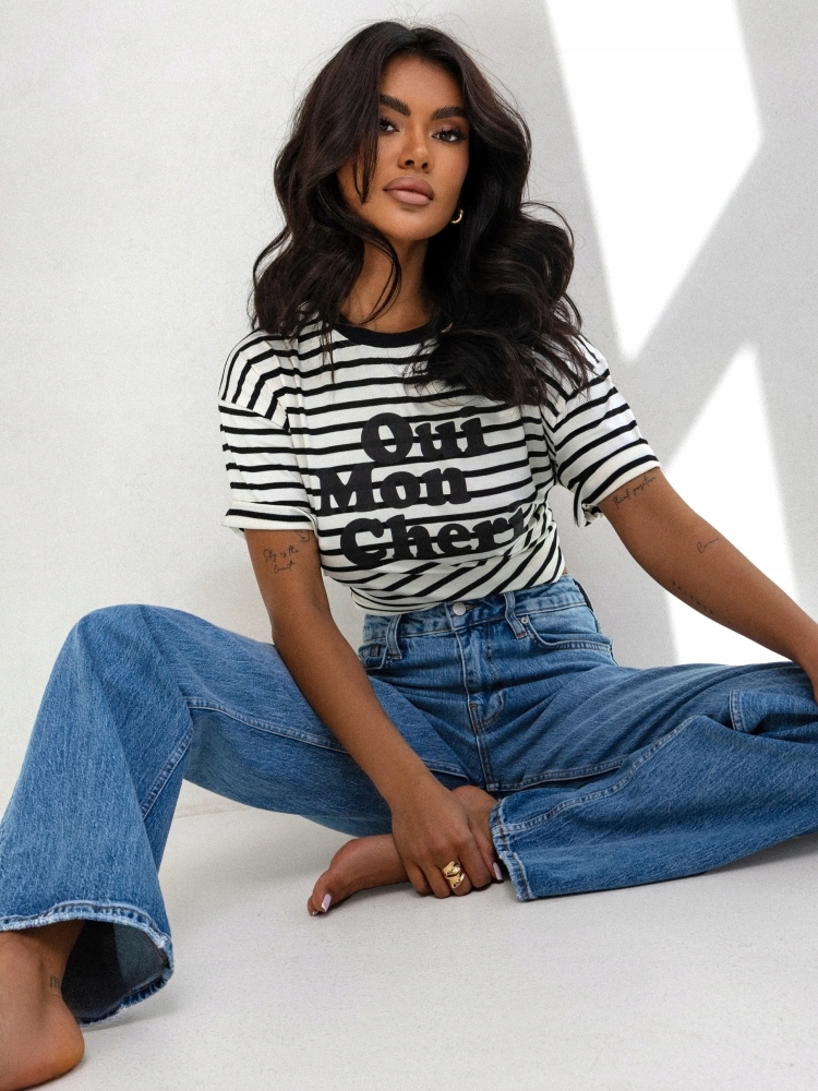- Rewelacyjny T-shirt w paski. Wykonany z wysokiej jakości materiału. Miły i miękki w dotyku. Luźny krój. Na przodzie znajduje się nadruk