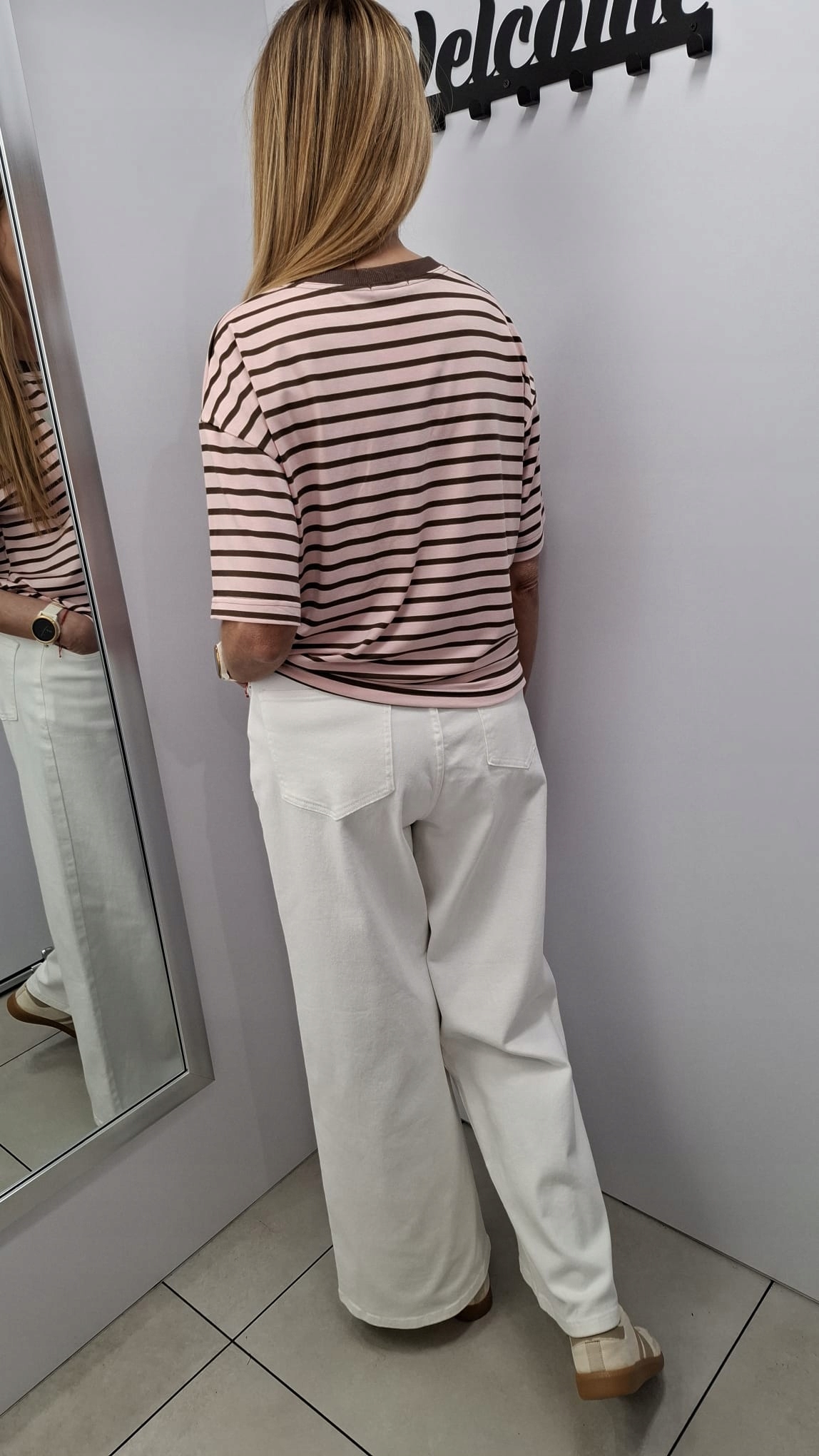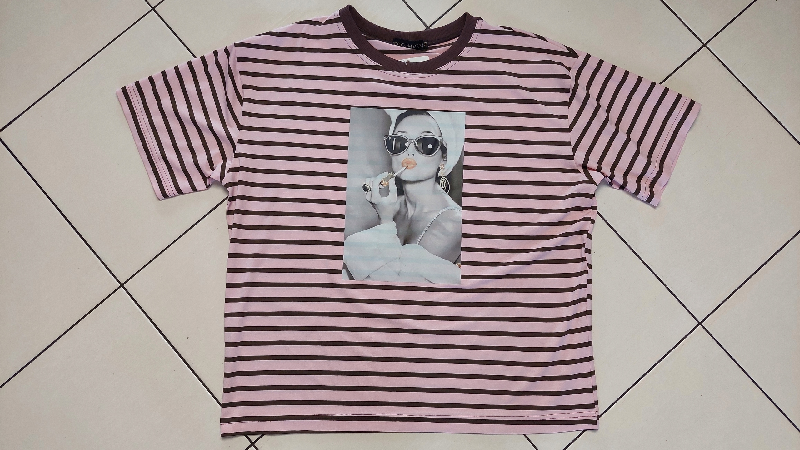 - Rewelacyjny T-shirt w paski. Wykonany z wysokiej jakości materiału. Miły i miękki w dotyku. Luźny krój. Na przodzie znajduje się duży nadruk