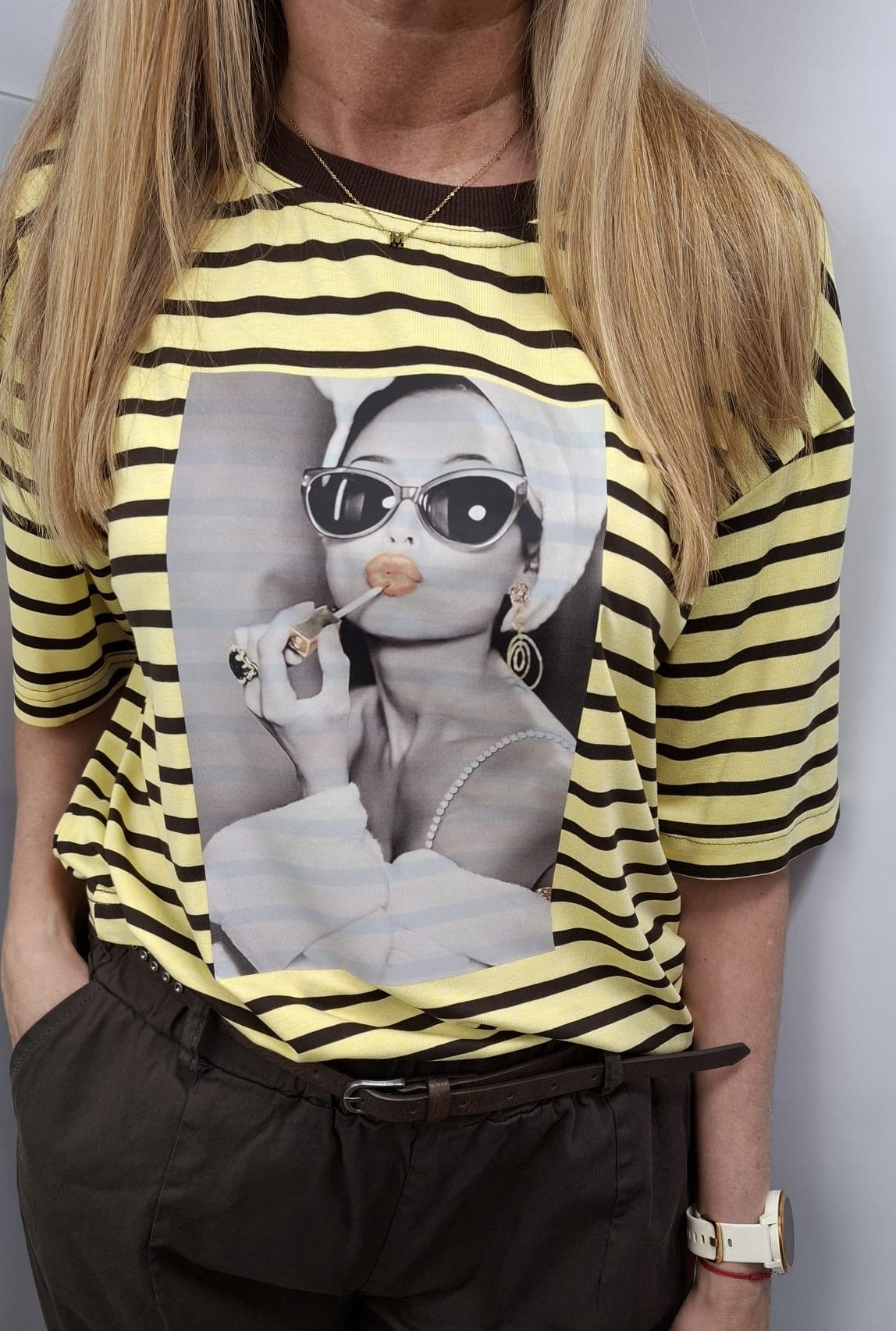 - Rewelacyjny T-shirt w paski. Wykonany z wysokiej jakości materiału. Miły i miękki w dotyku. Luźny krój. Na przodzie znajduje się duży nadruk