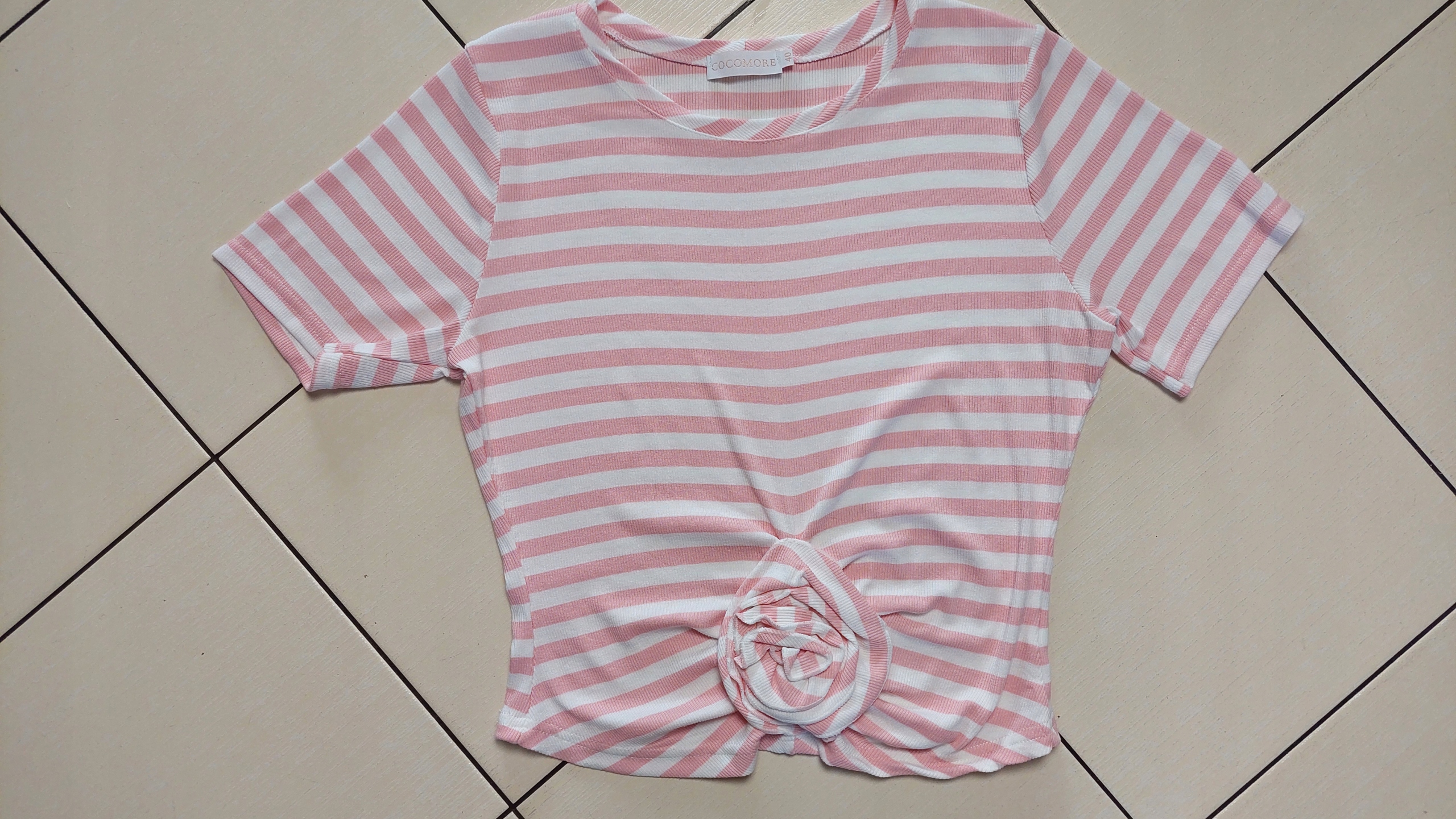 COCOMORE T-shirt Bluzka w Paski z Różą Różowy + Biały 34’/XS Nowość