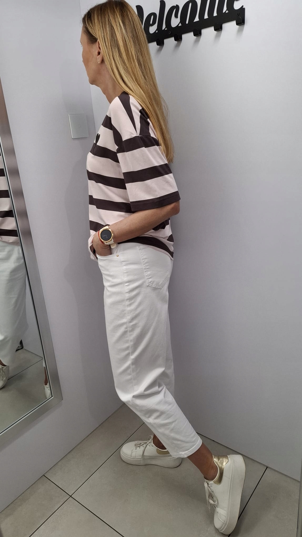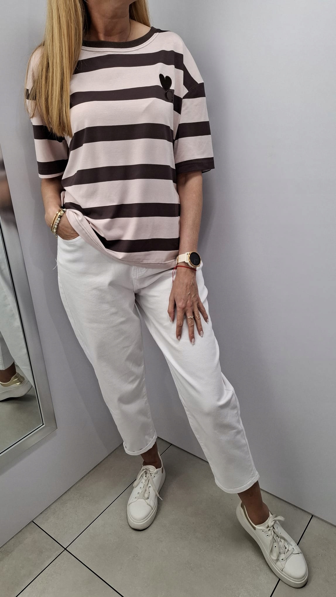 - Rewelacyjny T-shirt w paski. Wykonany z wysokiej jakości materiału. Miły i miękki w dotyku. Luźny krój. Na przodzie znajduje się ozdobny haft
