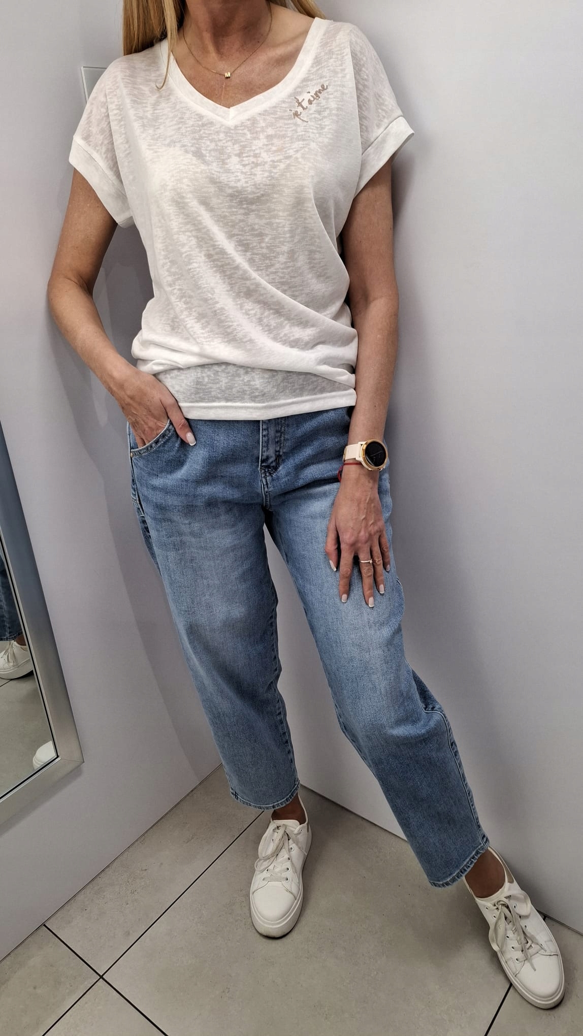 - Rewelacyjny T-shirt z kobiecym dekoltem V. Wykonany z wysokiej jakości materiału. Miły i miękki w dotyku. Taliowany krój. Na przodzie znajduje się ozdobny haft