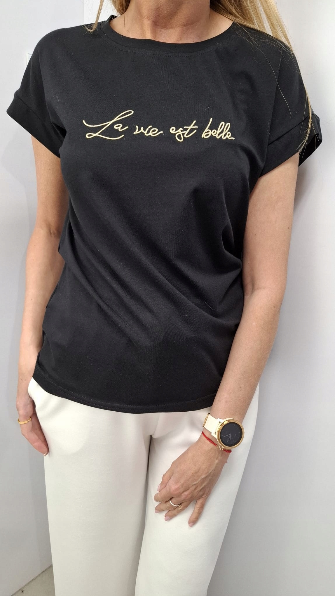 - Rewelacyjny T-shirt. Wykonany z wysokiej jakości materiału. Miły i miękki w dotyku. Taliowany krój. Na przodzie znajduje się haft