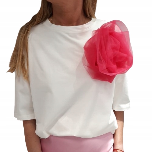 - Luźna bluzka, wykonana z wysokiej jakości materiału. Okrągły dekolt. Na przodzie znajduje się naszywka z tiulu w kształcie kwiatu. Szeroki, oversize krój