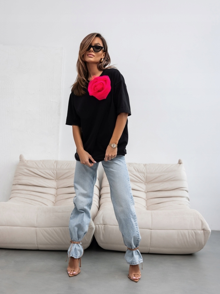 - Luźna bluzka, wykonana z wysokiej jakości materiału. Okrągły dekolt. Na przodzie znajduje się naszywka z tiulu w kształcie kwiatu. Szeroki, oversize krój