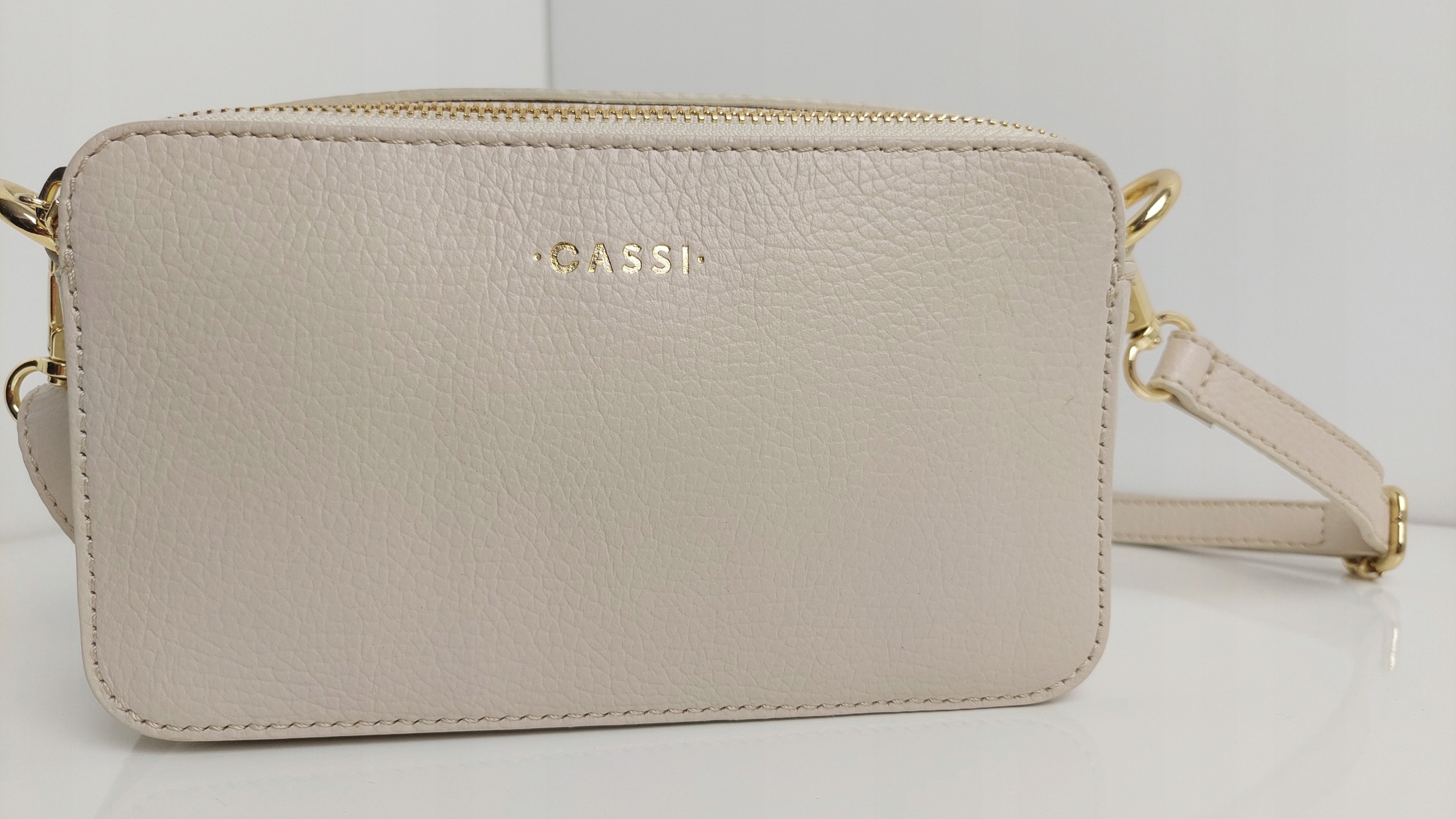 - Rewelacyjna torebka wykonana ze skóry groszkowej. Torebka posiada dwie komory, wewnątrz znajduje się dodatkowo kieszonka zapinana na suwak. Skórzany, regulowany pasek. Na przodzie torebki wybita złota pieczątka z nazwą Cassi