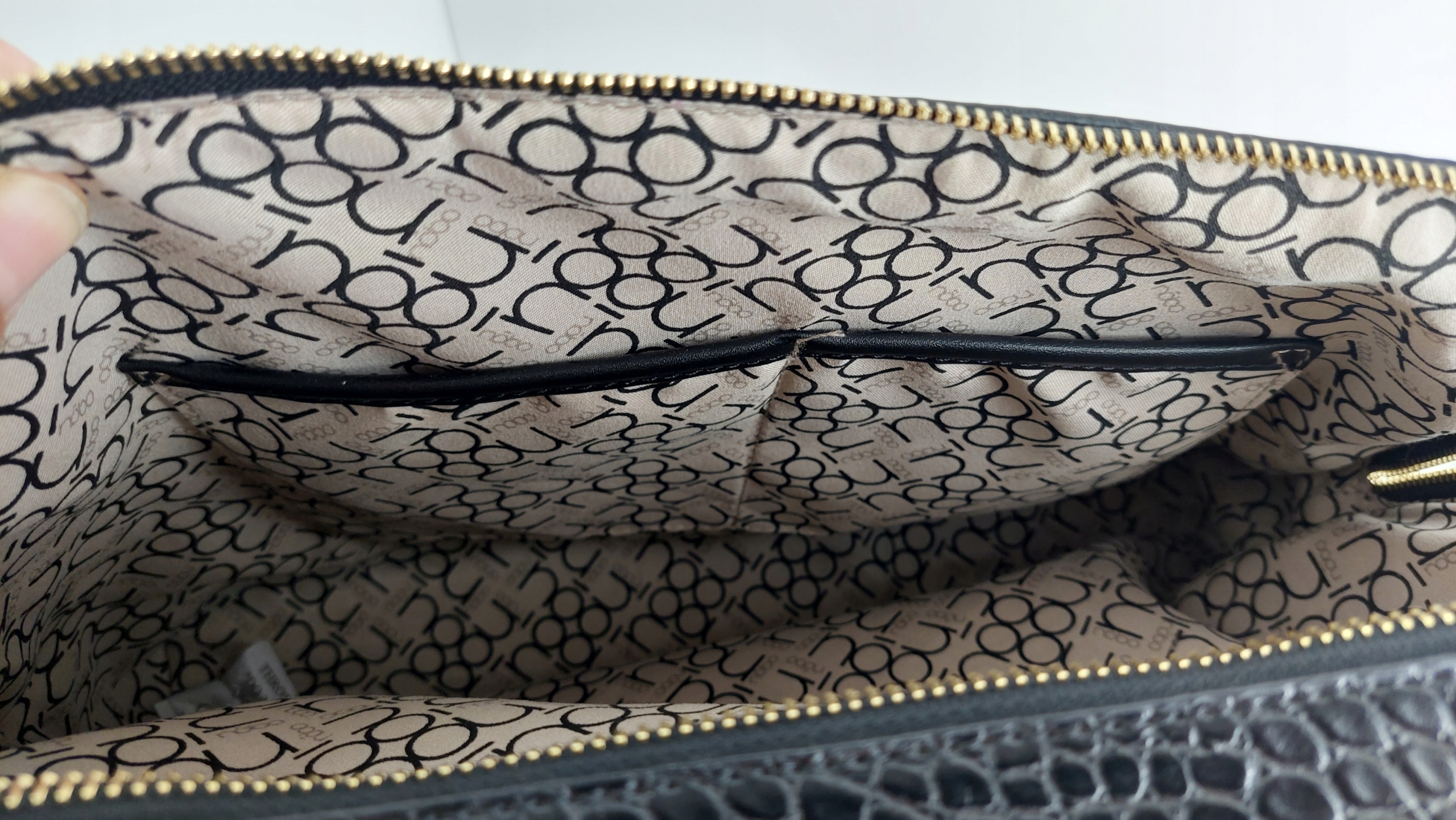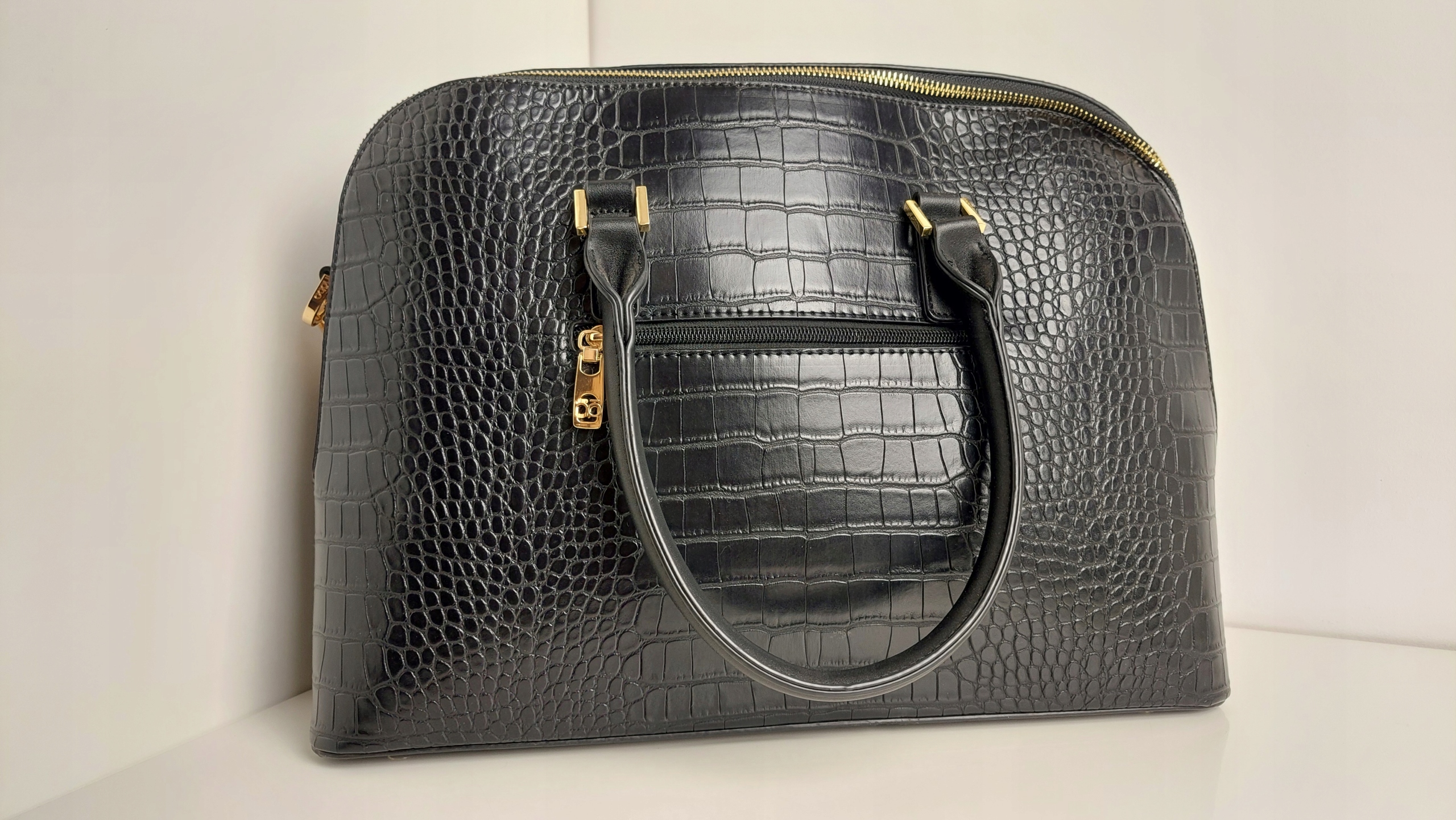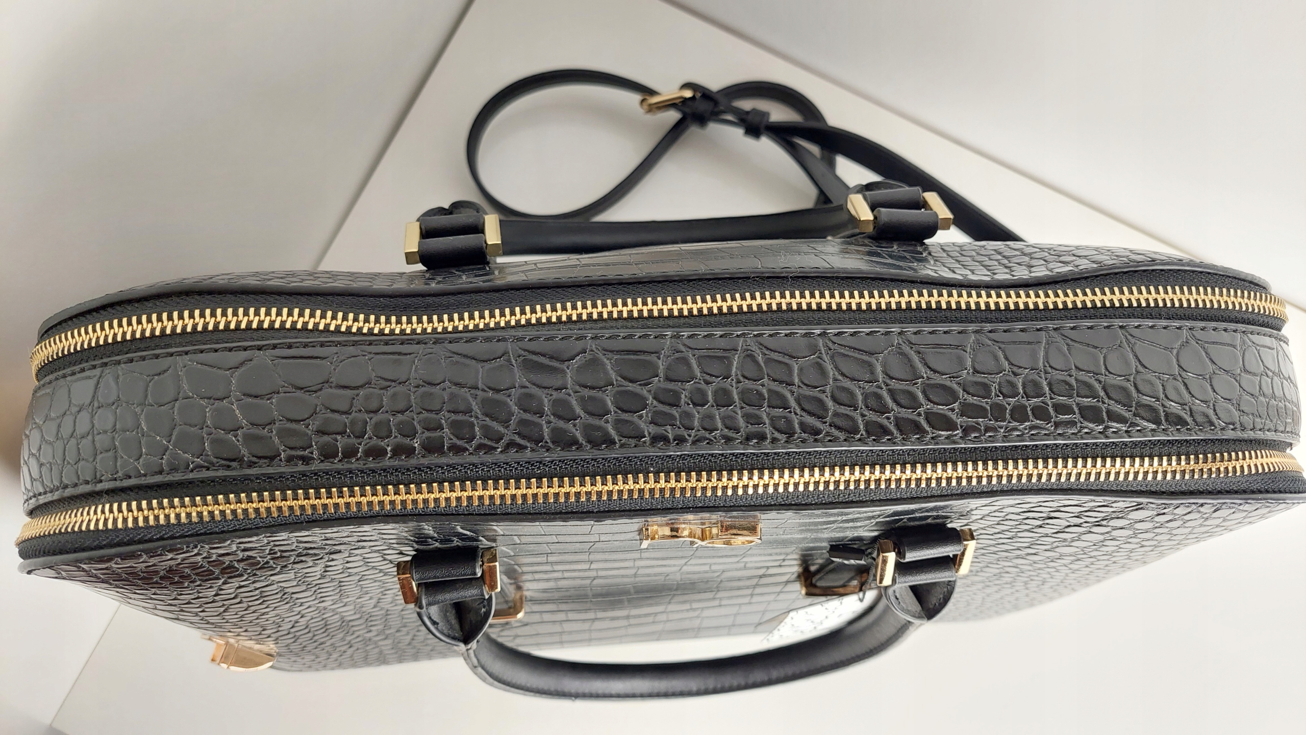 - Torebka typu Aktówka. Wykonana z wysokiej jakości fakturowanej skóry ekologicznej. Posiada pasek z regulacją długości , okucia w złotym kolorze. Wewnątrz dodatkowe kieszonki. Oryginalności dodaje logo. Pojemna mieści format A4. Posiada również przegrodę na laptop do14″